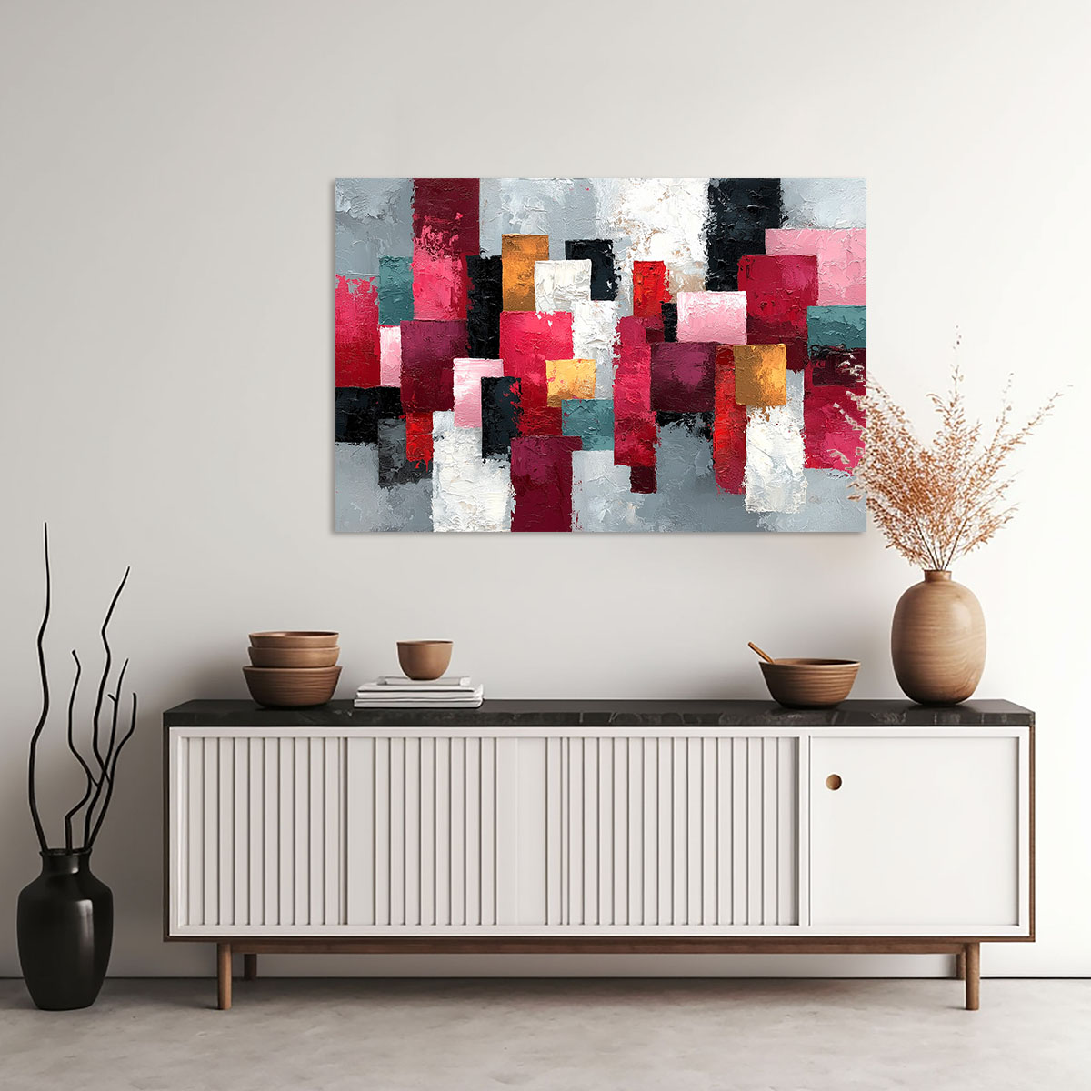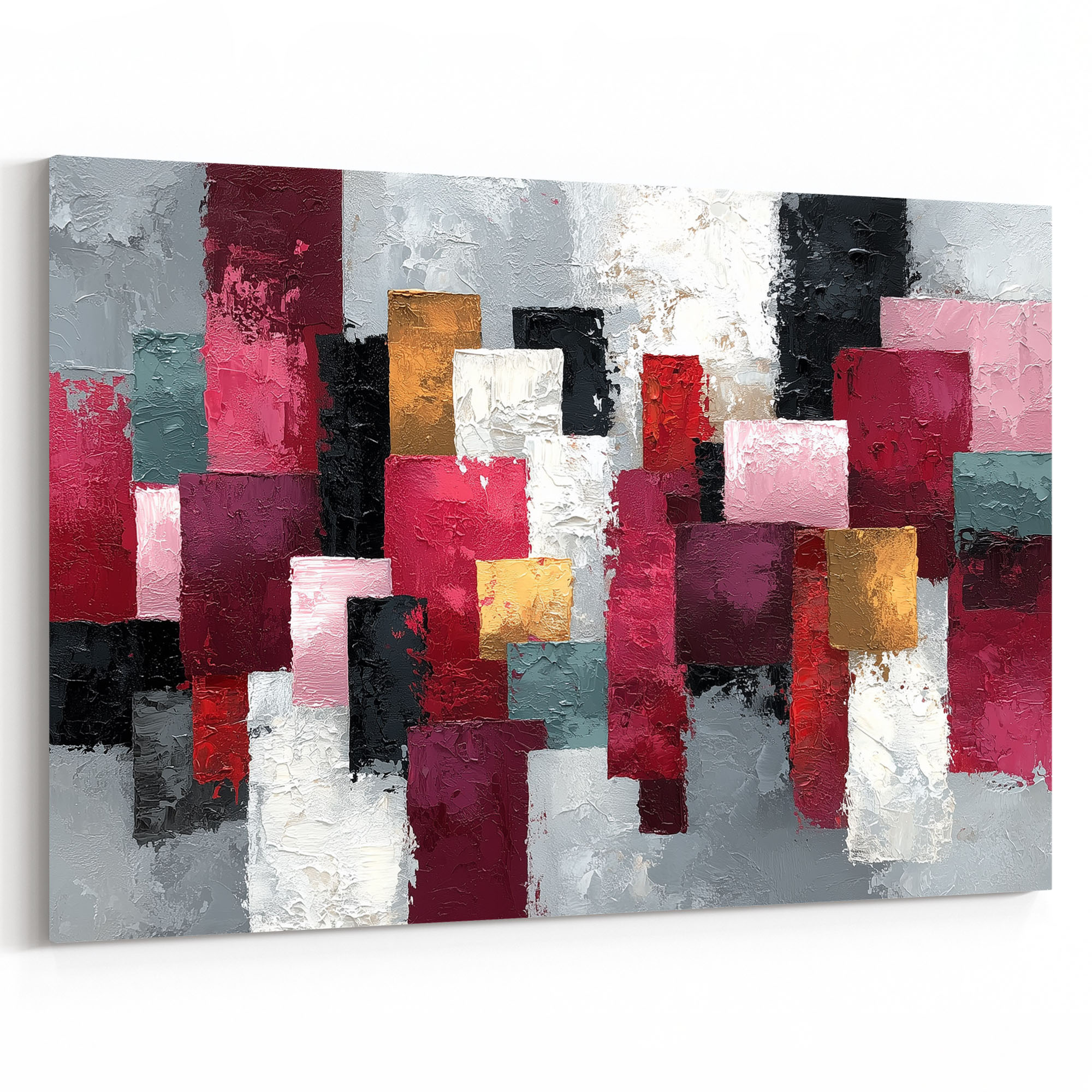 Strukturierte, rechteckige Farbflächen in verschiedenen Rot-, Rosa- und Weißtönen überlagern sich auf einem kühlen Grau-Hintergrund und schaffen eine Komposition, die an Rothkos Farbfeldmalerei ebenso erinnert wie an zeitgenössische Neo-Expressionisten. Die Farben sind nicht glatt aufgetragen, sondern zeigen die Spachtel- und Pinselspuren deutlich, was dem Bild eine taktile, fast skulpturale Qualität verleiht. Rotschattierungen reichen von tiefstem Karmesin über lebhaftes Scharlachrot bis zu zartem Altrosa, ergänzt durch goldgelbe Akzente und kühle Schwarztöne. Die Rechteckformen sind nicht perfekt geometrisch, sondern organisch verzerrt, was ihnen eine Menschlichkeit und Wärme verleiht. Das Bild schafft eine emotionale Spannung zwischen Ordnung und Chaos, zwischen Wärme und Kälte, die den Betrachter in einen Dialog einlädt. Ideal für moderne Sammlerwände und Räume, die zeitgenössische Malerei mit emotionaler Tiefe suchen.