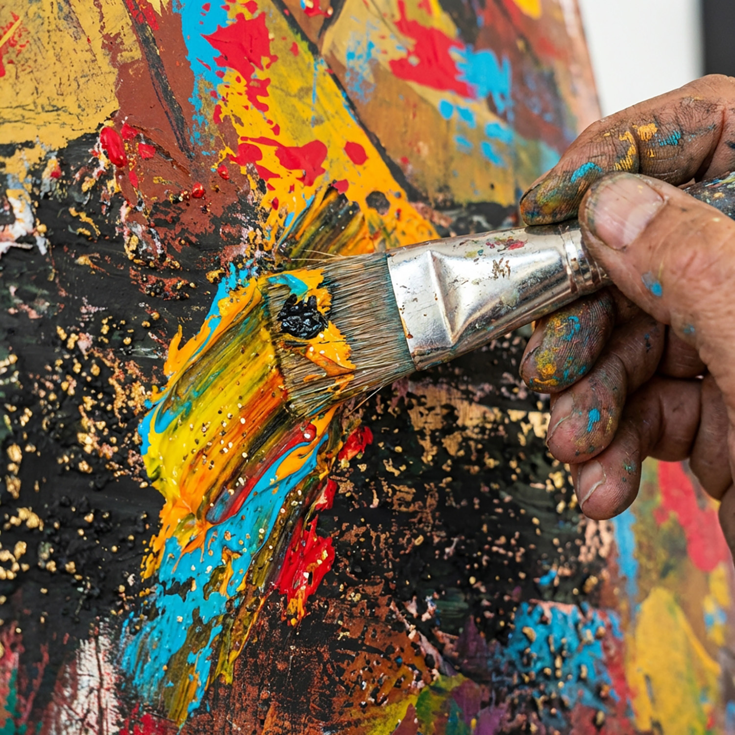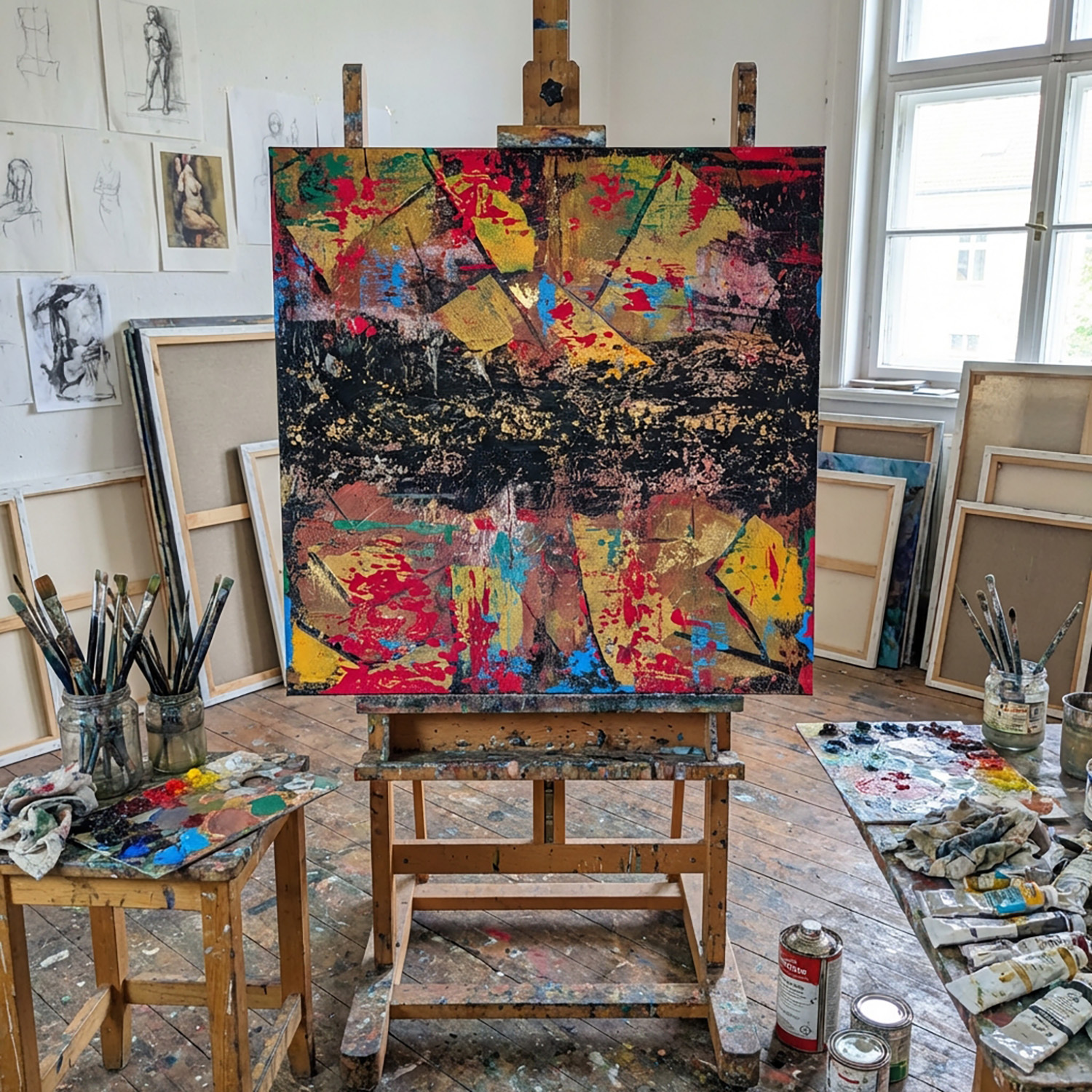 Um dieses dunkle, mineralische Zentrum entfaltet sich ein dynamisches Spiel aus den Primärfarben Rot, Gelb und Blau. Die Farben wurden in mehreren Schichten gespachtelt und teils wieder freigelegt, wodurch eine spannende Tiefe entsteht. Geometrische, schwarze Linien durchbrechen die Farbflächen wie architektonische Fragmente und verleihen der Komposition Stabilität.