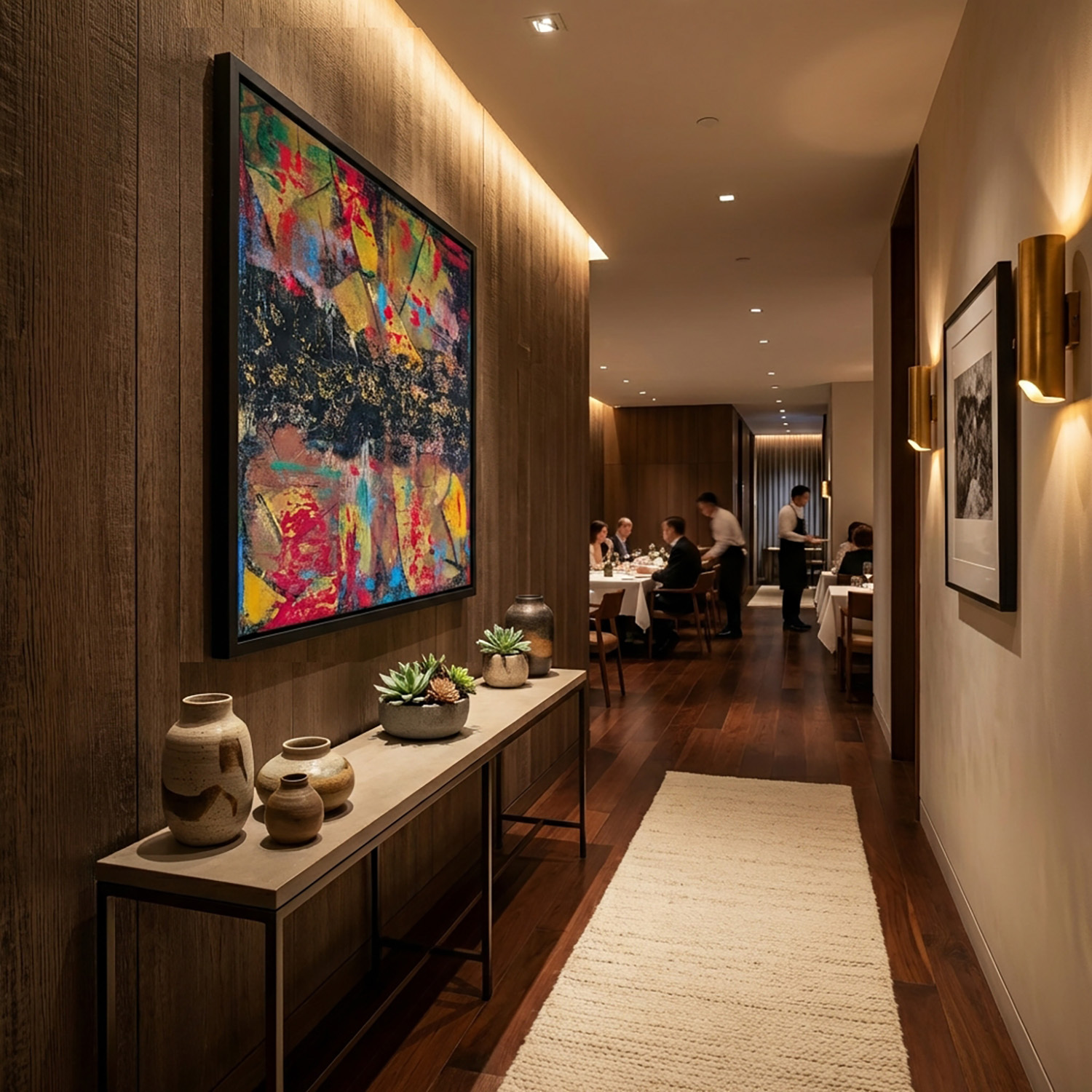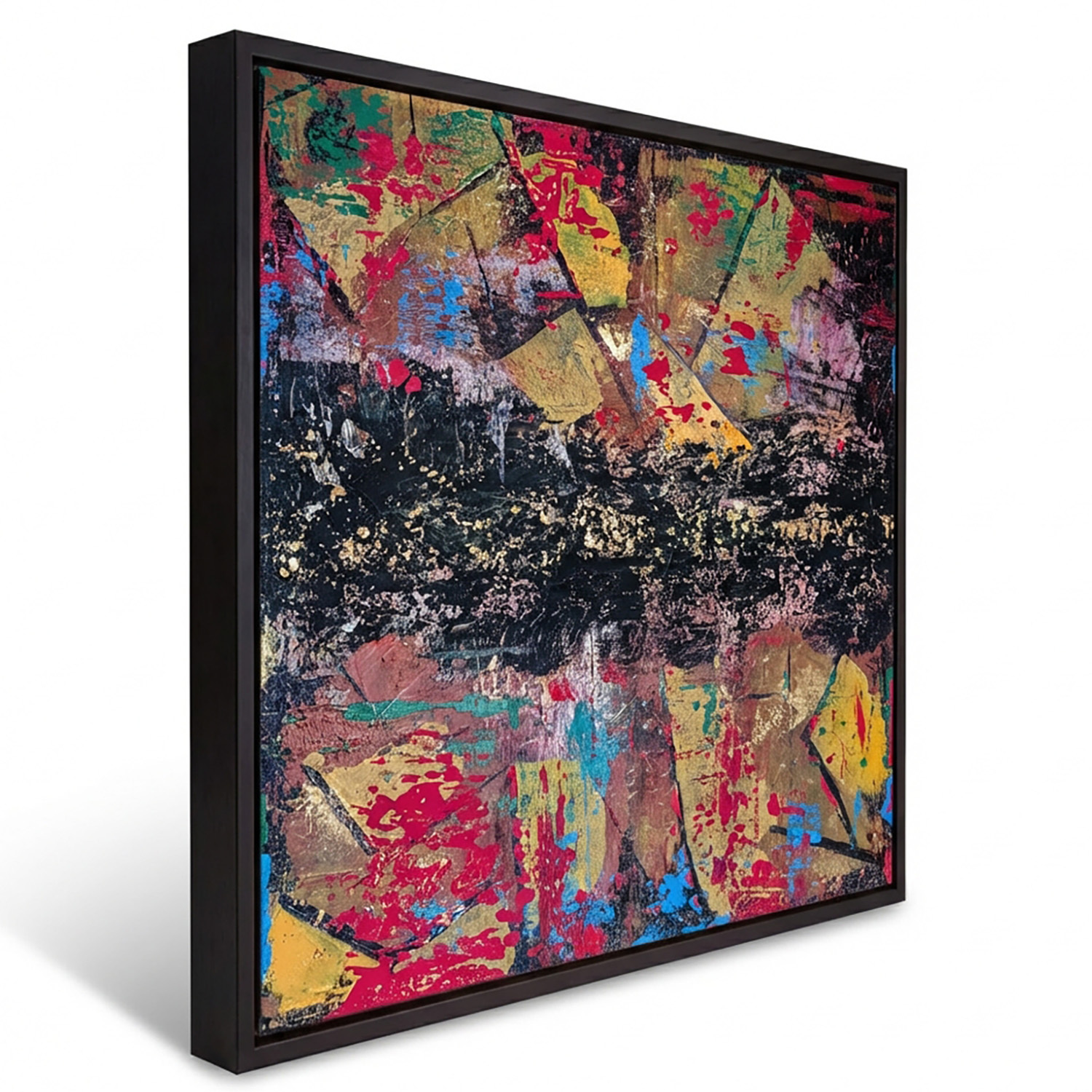 Der edle schwarze Schattenfugenrahmen schließt das Werk perfekt ab. Er lässt die Leinwand optisch „schweben“ und betont die Dreidimensionalität der Farbaufträge. Das Zusammenspiel aus der erdigen Struktur in der Mitte und dem lebhaften Farbrausch darüber hinaus macht das Bild zu einem fesselnden Blickfang, der zum Berühren der Oberflächen einlädt.