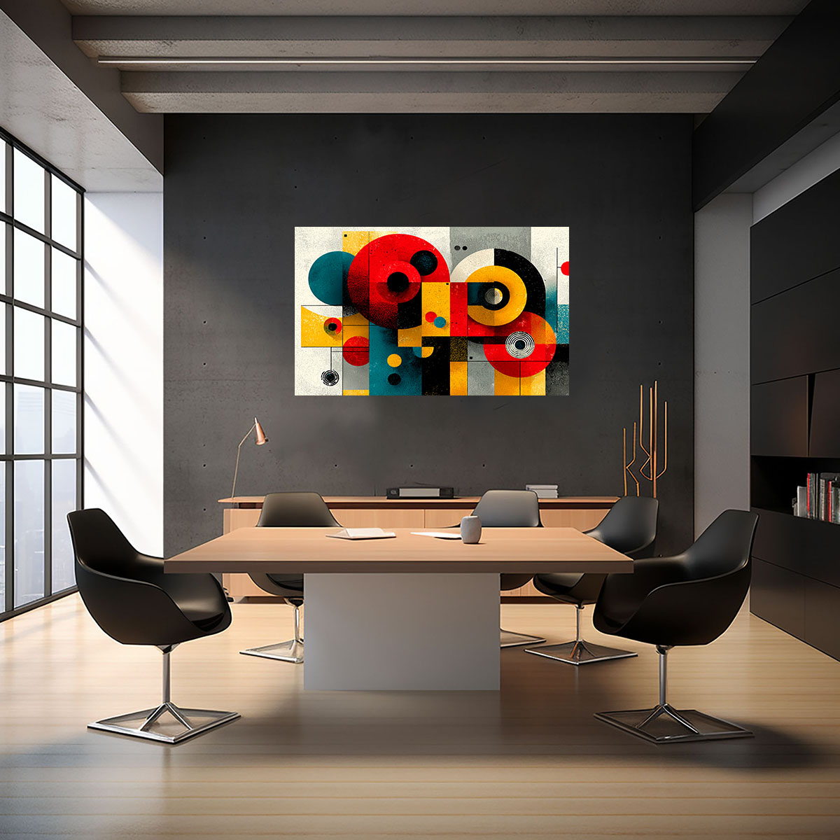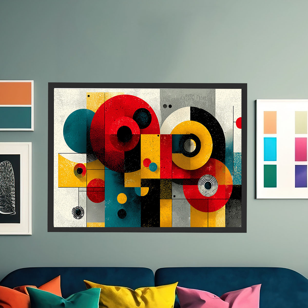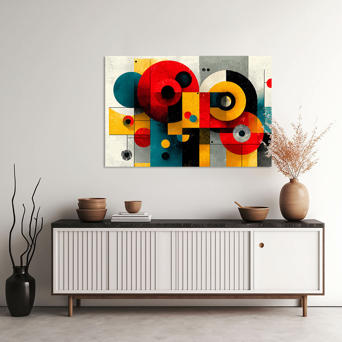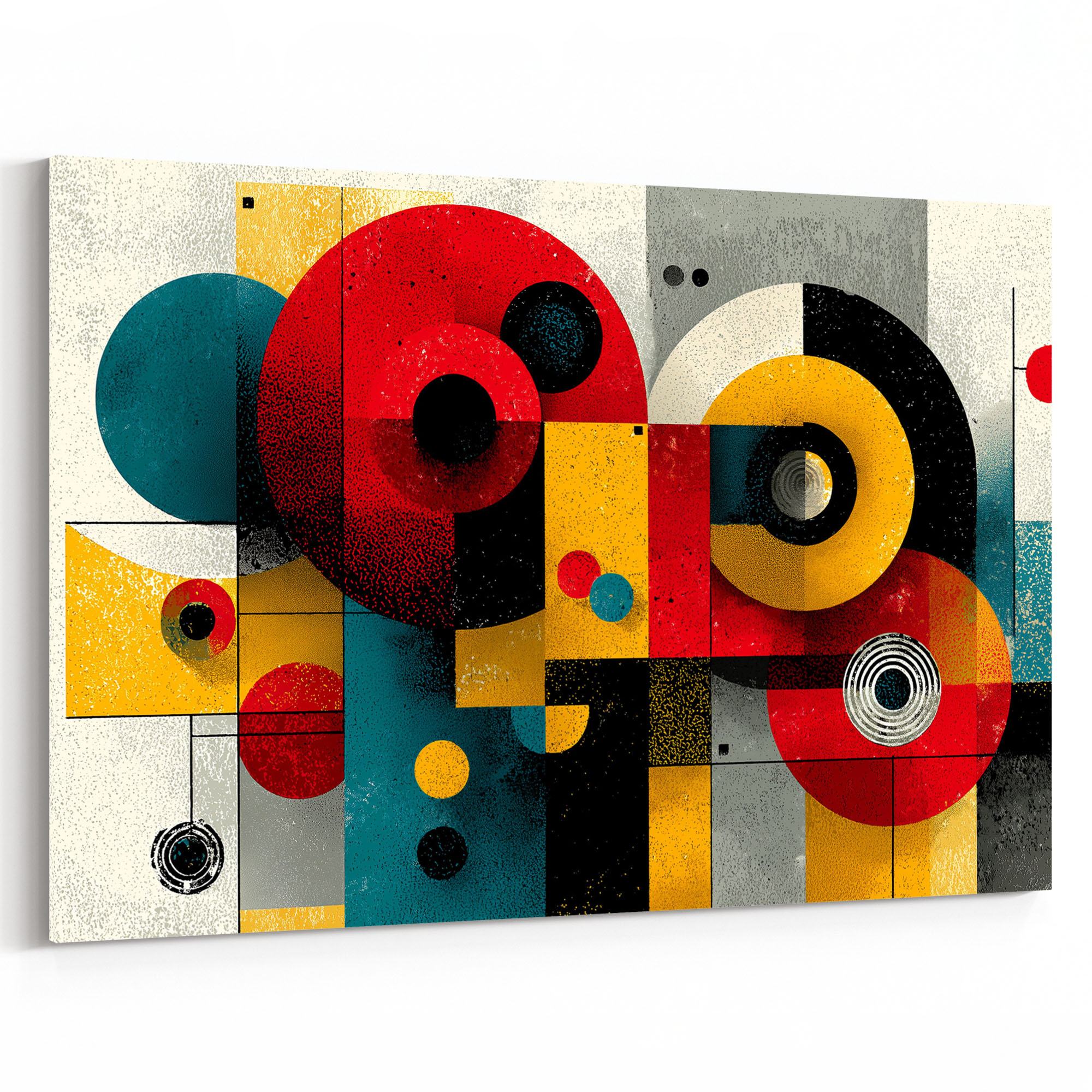 Eine lebhafte, spielerisch-ernste Komposition im Geist des Bauhaus zeigt Kreise, Halbkreise und Rechtecke in leuchtenden Primärfarben – Rot, Gelb, Blau, Schwarz -, die auf einem strukturierten, cremefarbenen bis grauen Hintergrund arrangiert sind. Die Formen variieren in Größe und Intensität: Einige sind flächig und satt gefärbt, andere zeigen konzentrische Kreise oder Linienstrukturen in ihrem Inneren. Die Komposition hat sowohl kindliche Verspieltheit als auch designerische Seriosität, was sie für ein breites Publikum ansprechend macht. Jede Form hat eine leicht strukturierte, fast körnige Oberfläche, die an Druck oder Siebdruck erinnert und dem Bild eine Handwerklichkeit verleiht. Das Zusammenspiel der Grundfarben ist bewusst direkt und unmissverständlich – es spricht eine universelle Designsprache, die Jahrzehnte überdauert hat. Ein Klassiker für moderne, designaffine Interieurs.