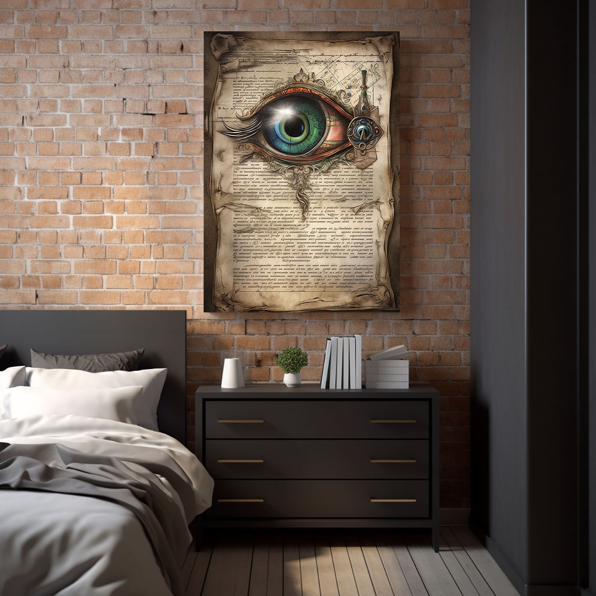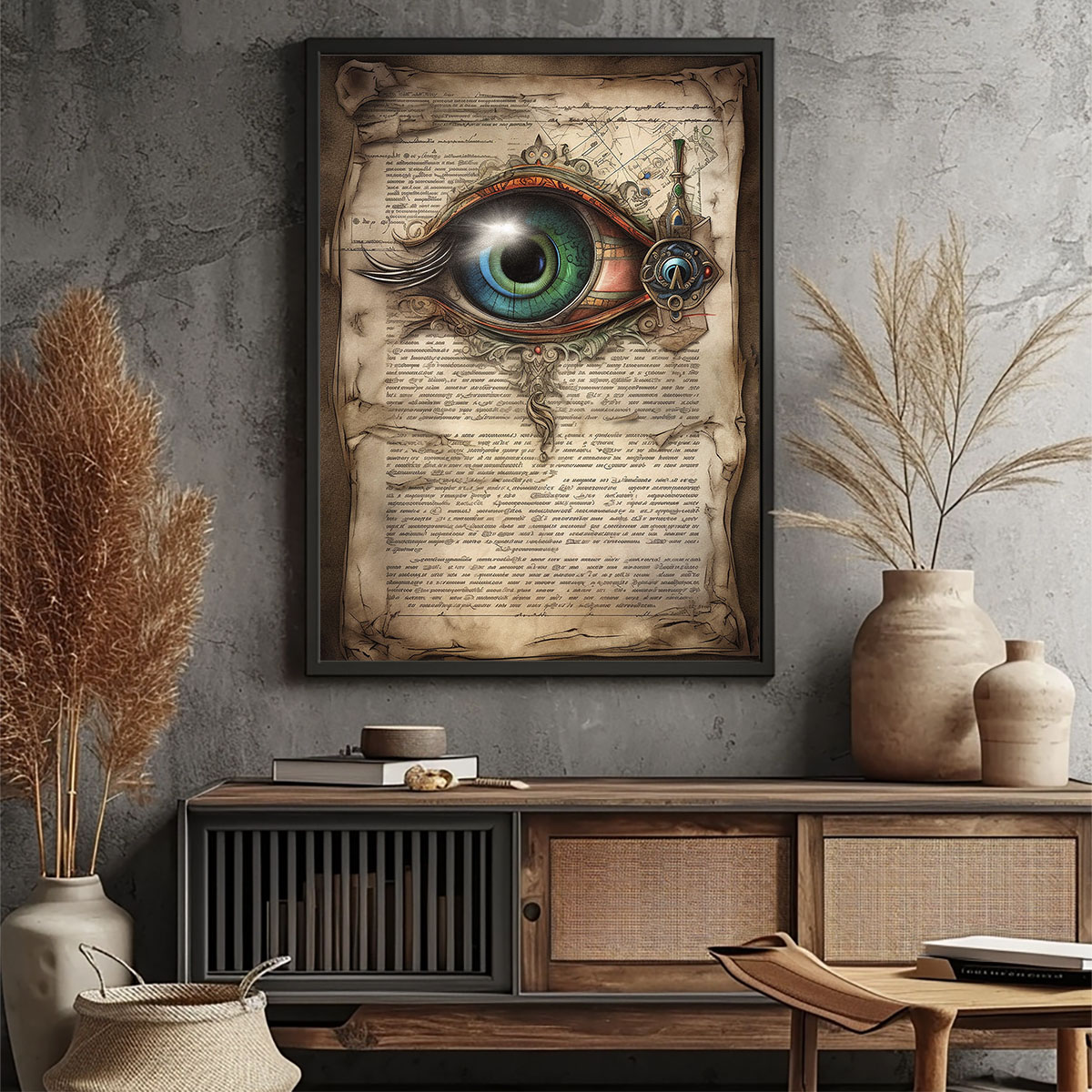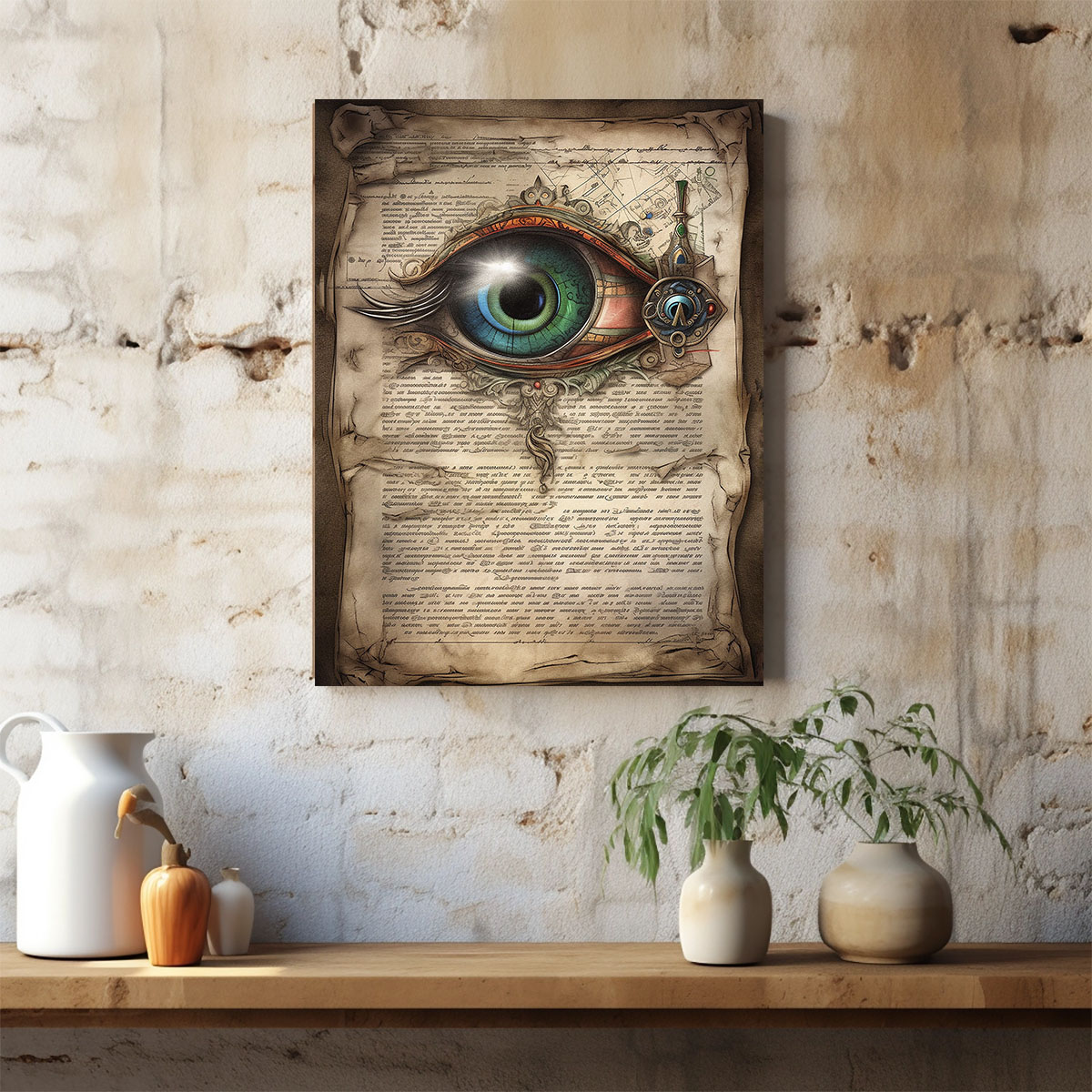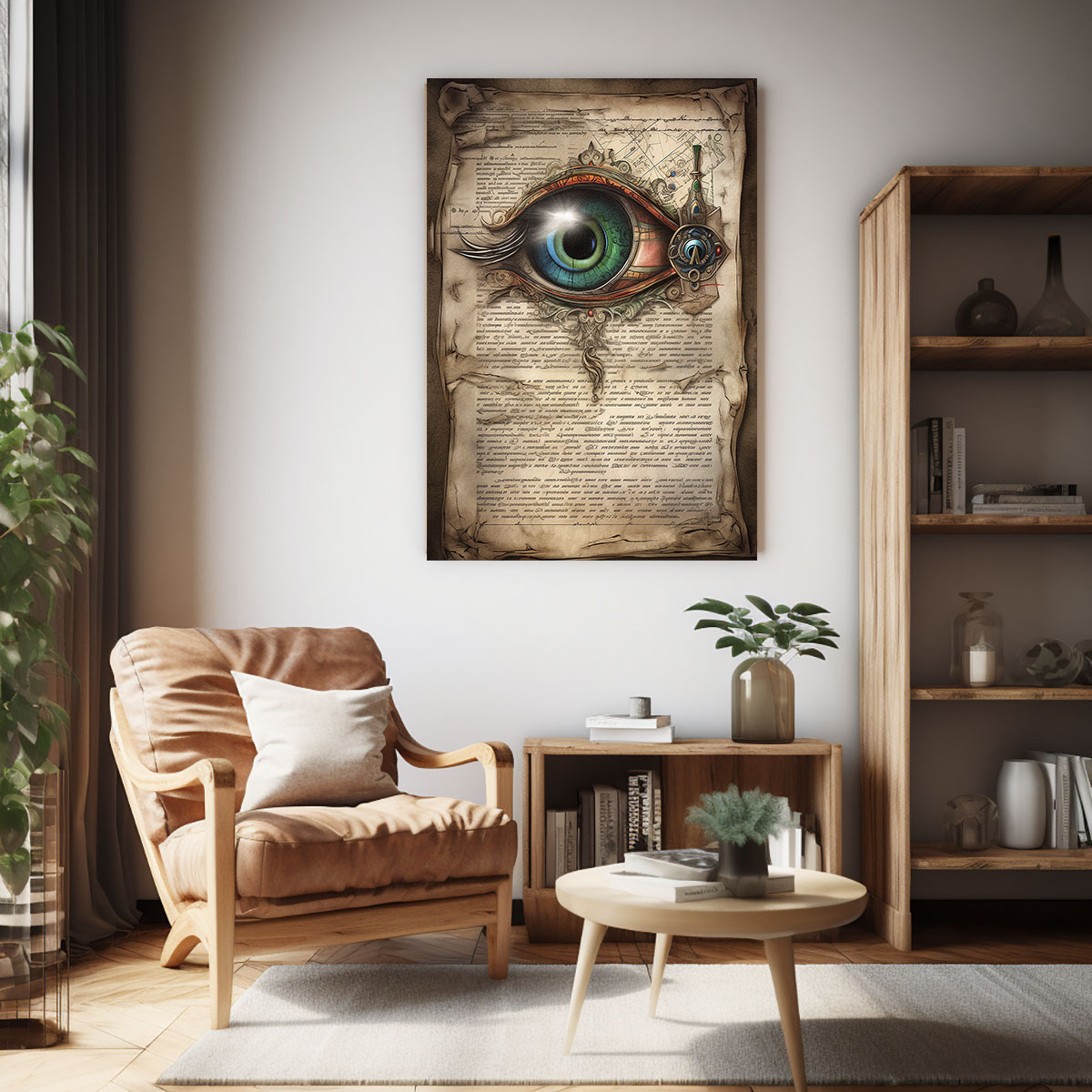 Auf einer vergilbten, zerknitterten Pergamentrolle prangt ein überdimensionales, detailreiches Auge. Die Iris schimmert in einem tiefen Blaugrün, umgeben von metallischen, steampunk-artigen Mechanismen und verschnörkelten Ornamenten. Das Weiß des Auges ist makellos und kontrastiert stark mit dem dunklen Hintergrund aus alten, unlesbaren Schriftzeichen und kartografischen Skizzen. Das Bild verbindet Mystik, Wissenschaft und Mechanik zu einem faszinierenden Gesamtbild. Die Fülle an Details lädt dazu ein, das Bild immer wieder neu zu entdecken jedes Mal fallen andere Elemente auf. Das Auge wirkt sowohl allwissend als auch verletzlich. Die Kombination aus antikem Pergament und futuristischen Elementen erzeugt eine zeitlose, surreale Atmosphäre. Dieses Werk passt perfekt in Räume, die Neugier, Wissen und Kreativität betonen sollen.