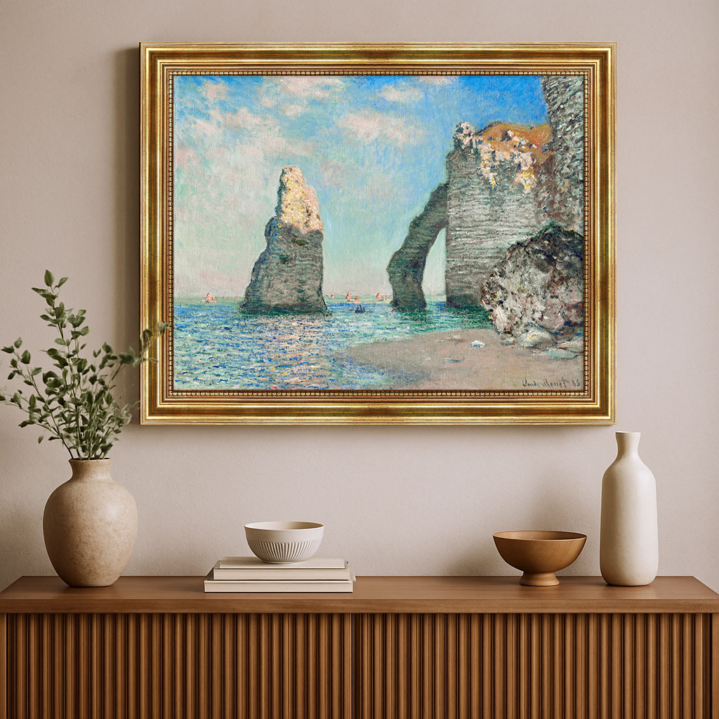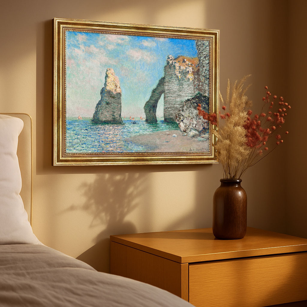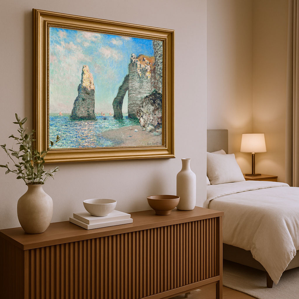 Das Gemälde zeigt die markanten Kreidefelsen von Étretat in der Normandie, Frankreich. Besonders charakteristisch ist der natürliche Felsbogen “Falaise d’Aval” (die Klippe unterhalb). Monet war von dieser Küstenlandschaft fasziniert und malte sie zu verschiedenen Zeiten und unter unterschiedlichen Lichtverhältnissen.