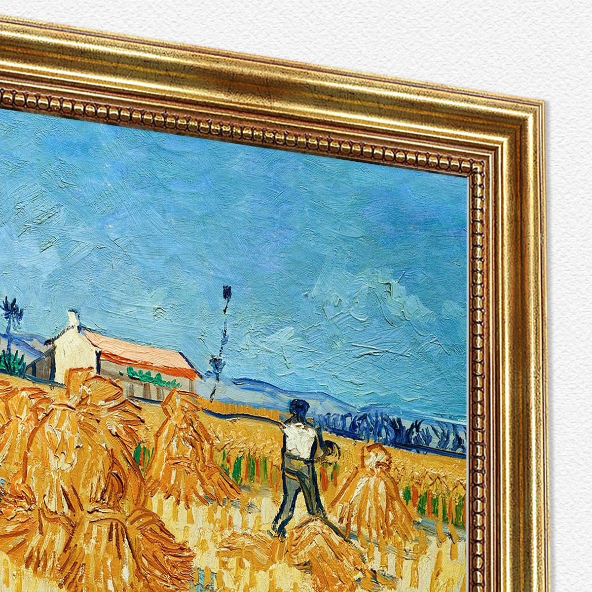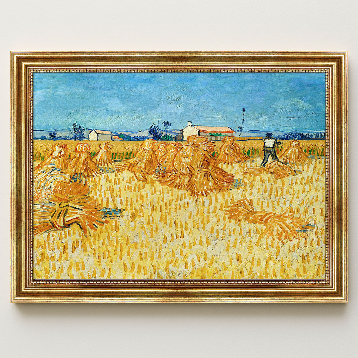 Im Vordergrund sind zahlreiche, leuchtend gelbe Getreidegarben kunstvoll aufgestellt oder liegen verstreut auf dem Feld. Auf der rechten Seite ist eine einzelne Figur zu sehen, die an der Ernte arbeitet und dem Bild eine menschliche Dimension verleiht.