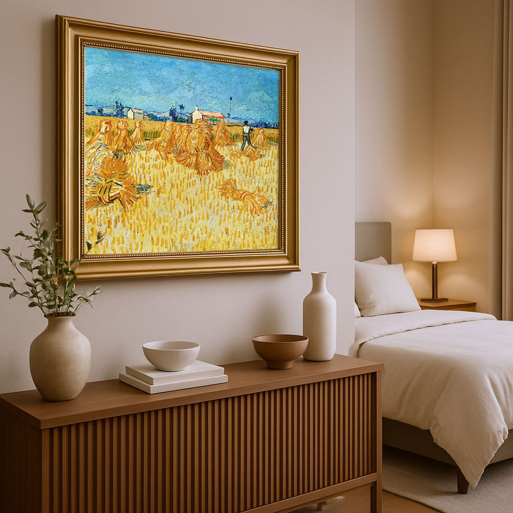 Das Gemälde zeigt “Ernte in der Provence” (auch bekannt als “Kornfeld mit Garben” oder “Die Ernte”) von Vincent van Gogh aus dem Jahr 1888. Es ist eine lebendige Darstellung einer sommerlichen Landschaft, die von einem weiten Feld mit goldenem Getreide dominiert wird, das bereit zur Ernte ist.