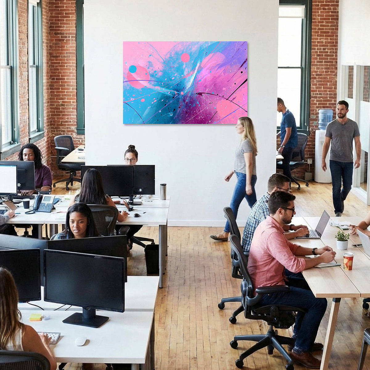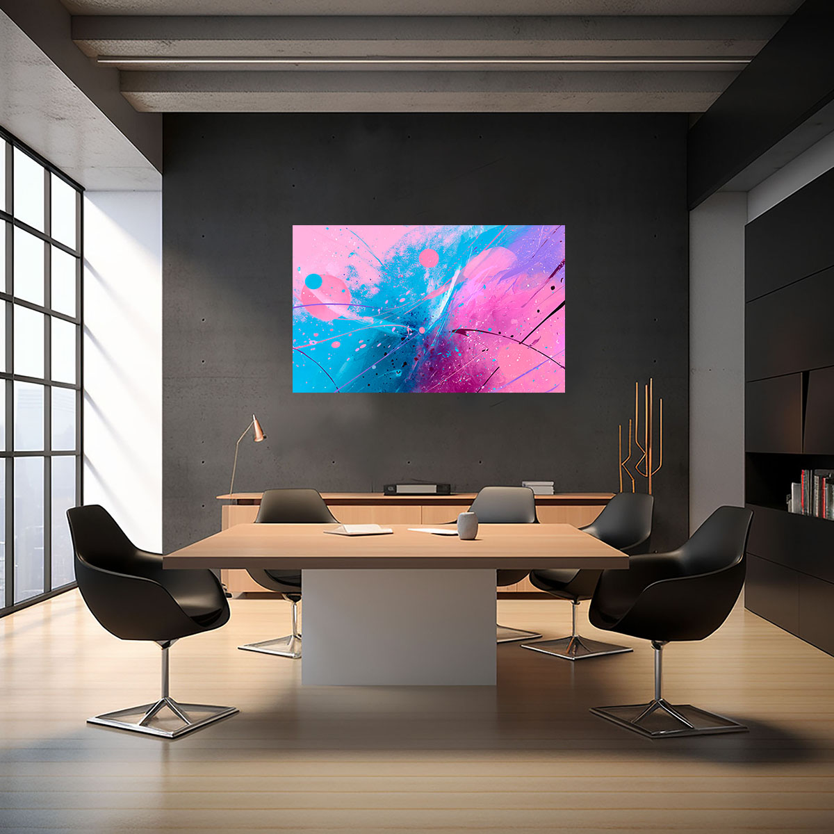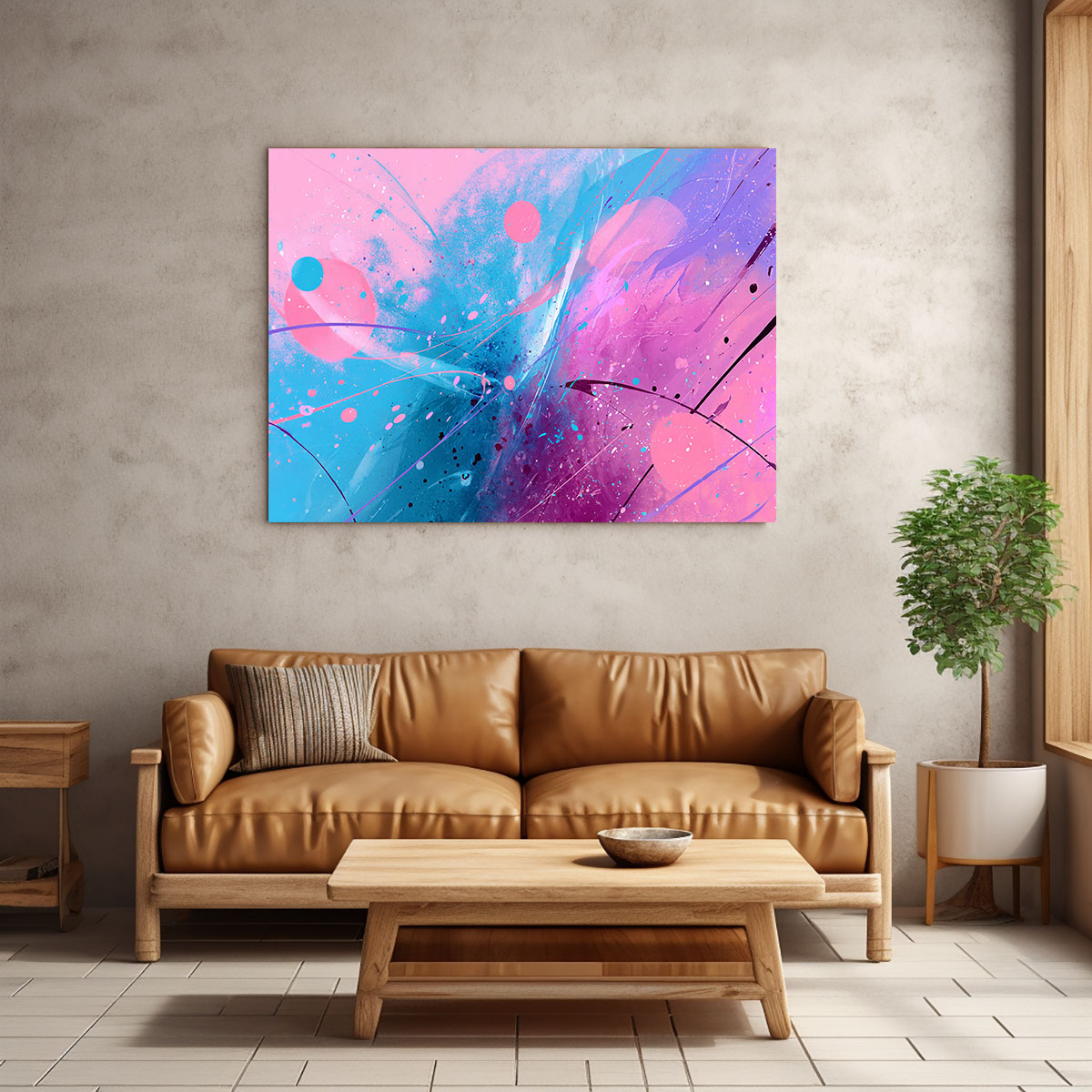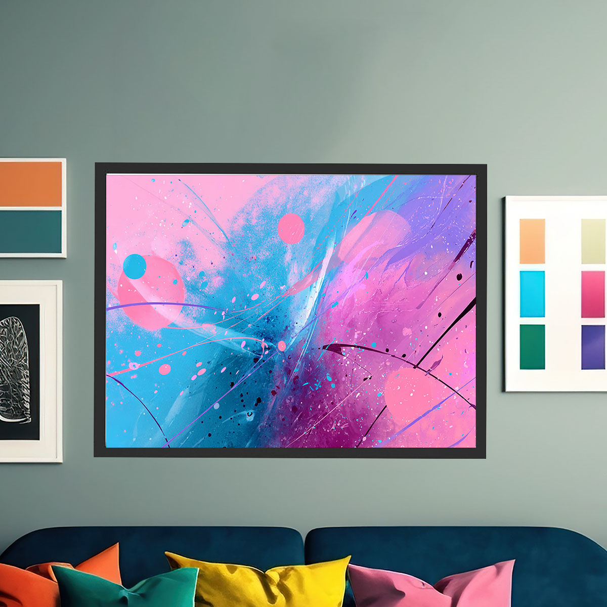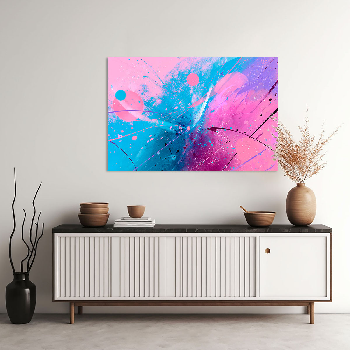 Ein leichtes, luftiges Bild voller Spontaneität und Verspieltheit, das an die abstrakten Aquarelle der Moderne erinnert. Auf einem hellen, fast weißen Hintergrund verteilen sich großzügige Farbflächen in sattem Pink und frischem Blau, die durch weiche, fließende Übergänge miteinander verbunden sind. Schwarze Linien – mal gerade, mal geschwungen – durchziehen die Komposition wie impulsive Zeichengesten und geben dem Werk eine grafische Struktur. Kleine Farbspritzer und -punkte in Pink und Blau lockern die Komposition auf und verleihen ihr eine prickelnde Lebendigkeit. Die Gesamtwirkung ist frisch, modern und feminin-elegant, ohne in Sentimentalität zu verfallen. Das Bild wirkt wie der Ausdruck eines freudigen, unbeschwerten Moments – eine visuelle Leichtigkeit, die sich auf den Raum und seine Bewohner überträgt. Ideal für helle, moderne Räume mit einem Sinn für zeitgenössische Kunst und frische Farben.