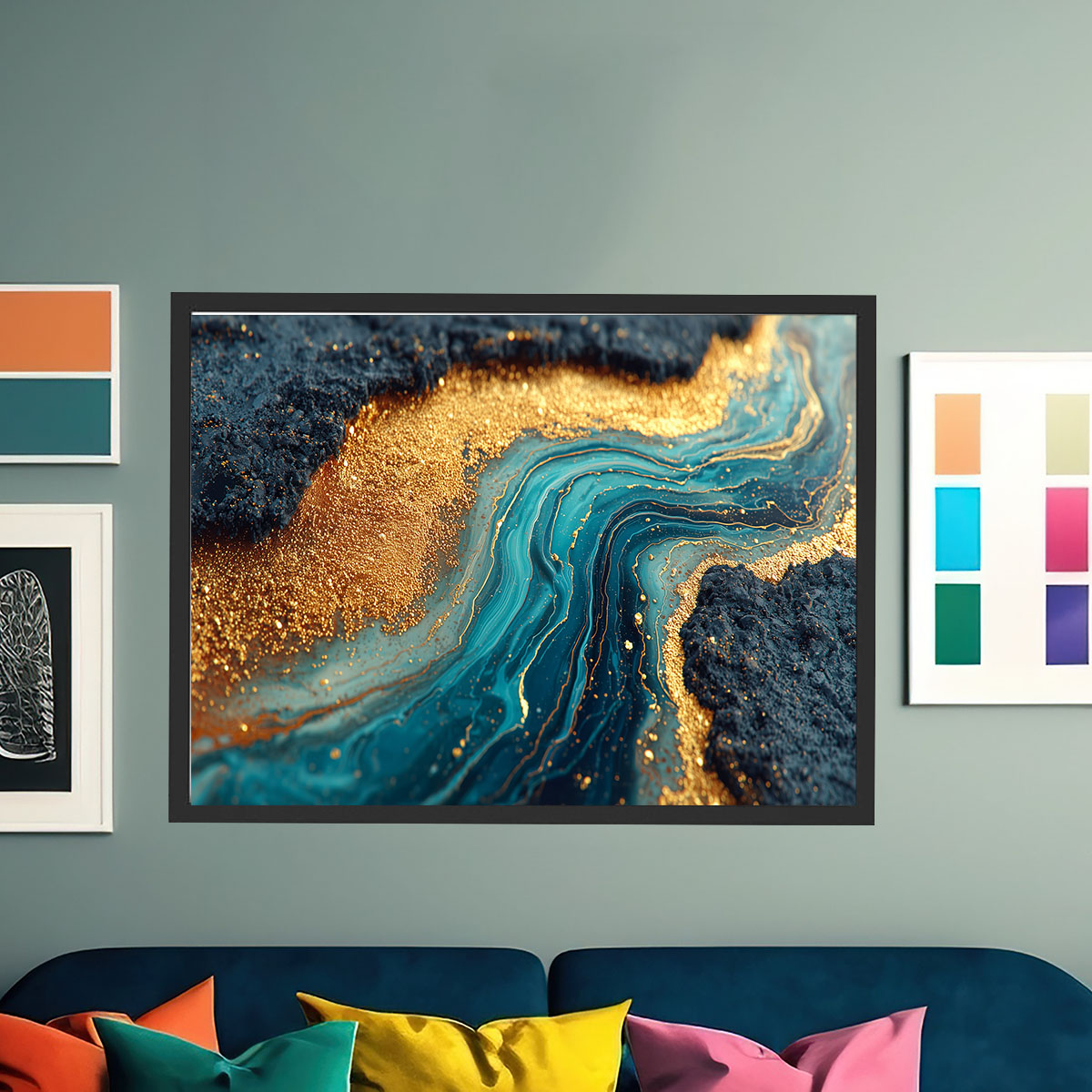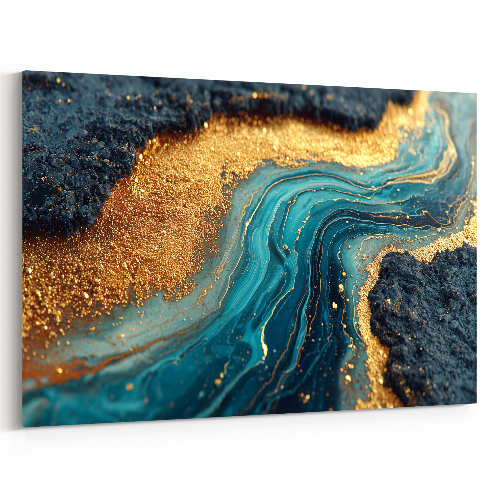 Intensive Marmortextur in Teal und Schwarz mit leuchtendem Goldstaub in Fluid-Art-Technik