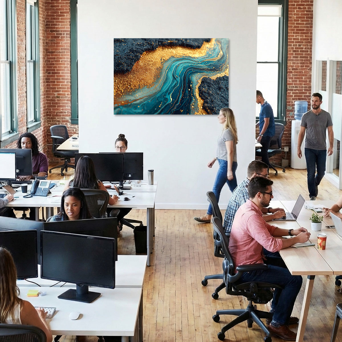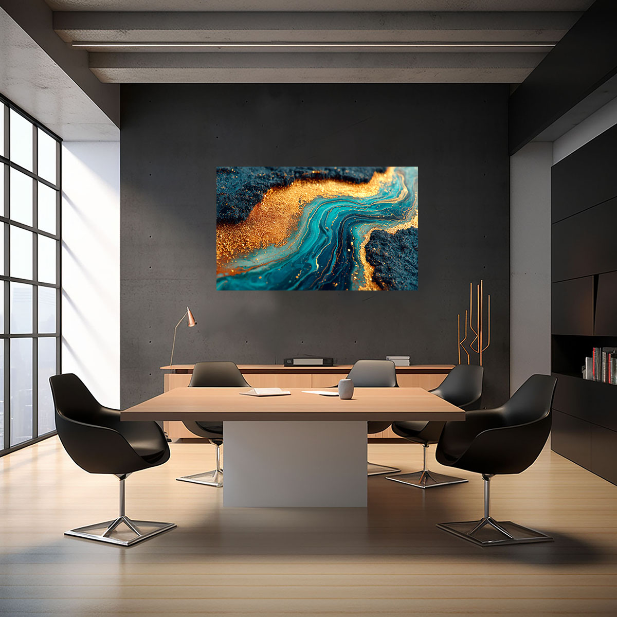 Eine noch dunklere, dramatischere Variante der Fluid-Art-Marmortextur, bei der Teal und fast schwarze Töne dominieren und die goldenen Einschlüsse wie Sternenhimmel oder Goldstaub wirken. Die Farbströme sind dichter und kontrastreicher als in verwandten Variationen – das Teal leuchtet intensiv gegen die dunklen Partien und schafft eine fast elektrische Spannung. Die goldenen Partikel verteilen sich unregelmäßig über die Bildfläche und erzeugen mit ihrer körnigen Textur einen faszinierenden Kontrast zur Glätte der fließenden Farbflächen. Das Bild hat eine rohe, mineralische Qualität, die an seltene Edelsteine wie Malachit oder Labradorit erinnert. Gleichzeitig wirkt es durch die Goldakzente edel und luxuriös. Die dunkle Farbpalette macht es besonders geeignet für Akzentwände, dunkle Interieurs und Räume, die einen Hauch von Mysterium und Exklusivität ausstrahlen sollen.