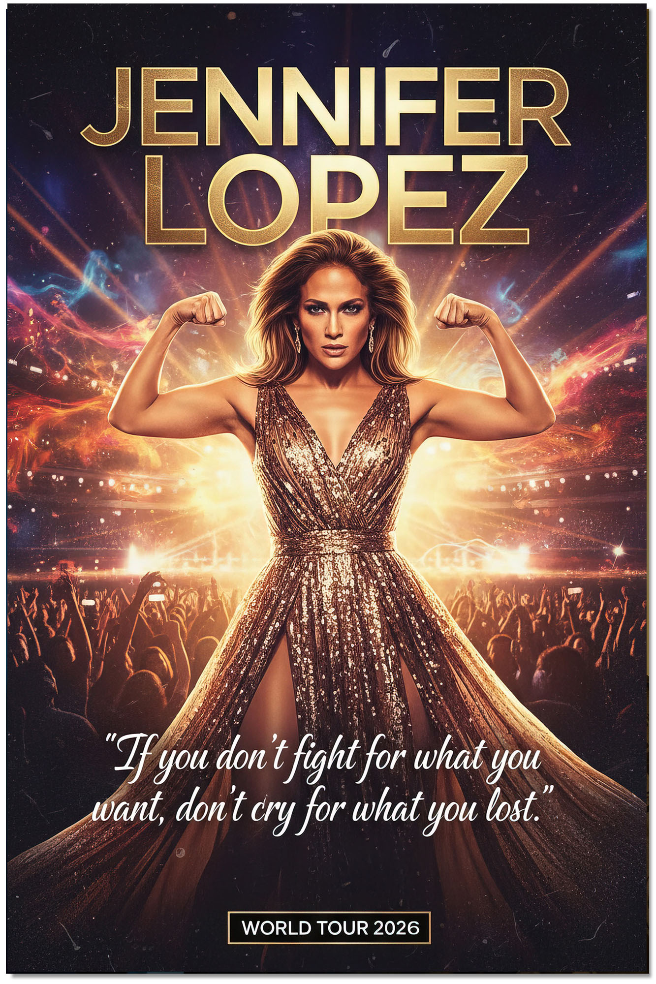 The central image features Jennifer Lopez in a commanding pose, flexing both biceps while looking directly at the viewer. She is wearing a dazzling, gold sequined gown with a deep V-neck and high slits, which seems to shimmer and flow outwards, covering the crowd below.