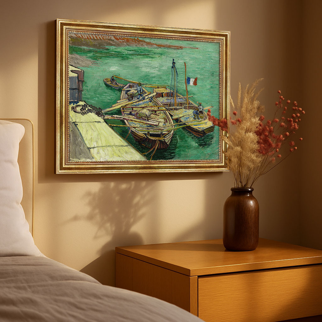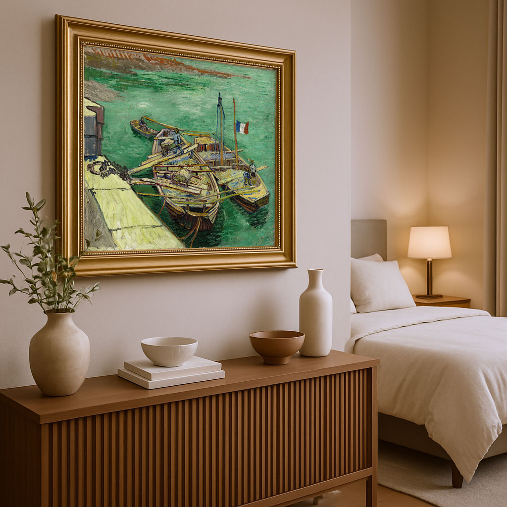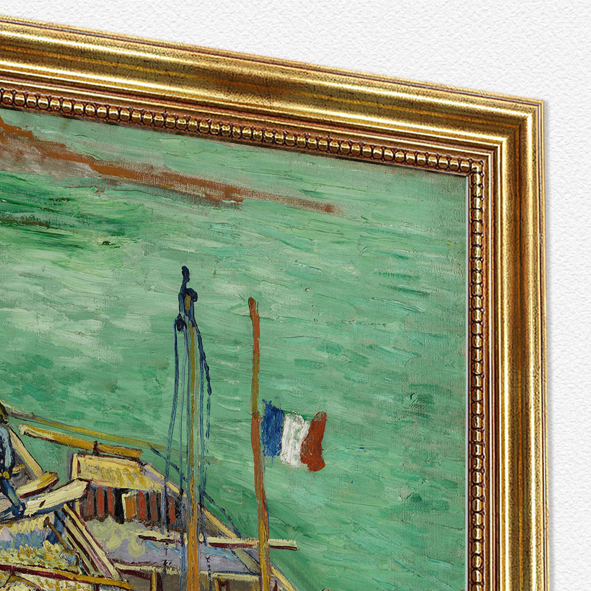 Kai mit Männern, die Sandkähne entladen (auch bekannt als “Die vertäuten Boote”) von Vincent van Gogh, gemalt im Jahr 1888 in Arles. Die Szene ist eine lebendige Darstellung des geschäftigen Treibens an einem Fluss- oder Kanalufer. Im Vordergrund dominiert das leuchtend grüne Wasser, das in verschiedenen Schattierungen und Pinselstrichen gemalt ist und die Reflexionen der Umgebung einfängt.