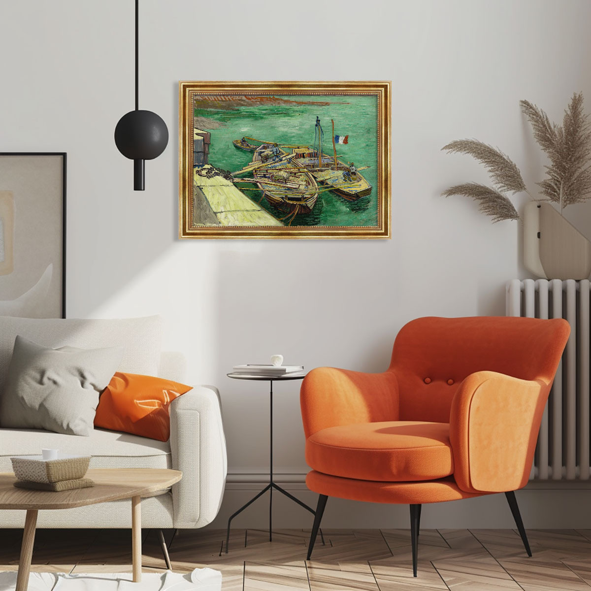 Kai mit Männern, die Sandkähne entladen von Vincent van Gogh Bild mit Rahmen in Gold