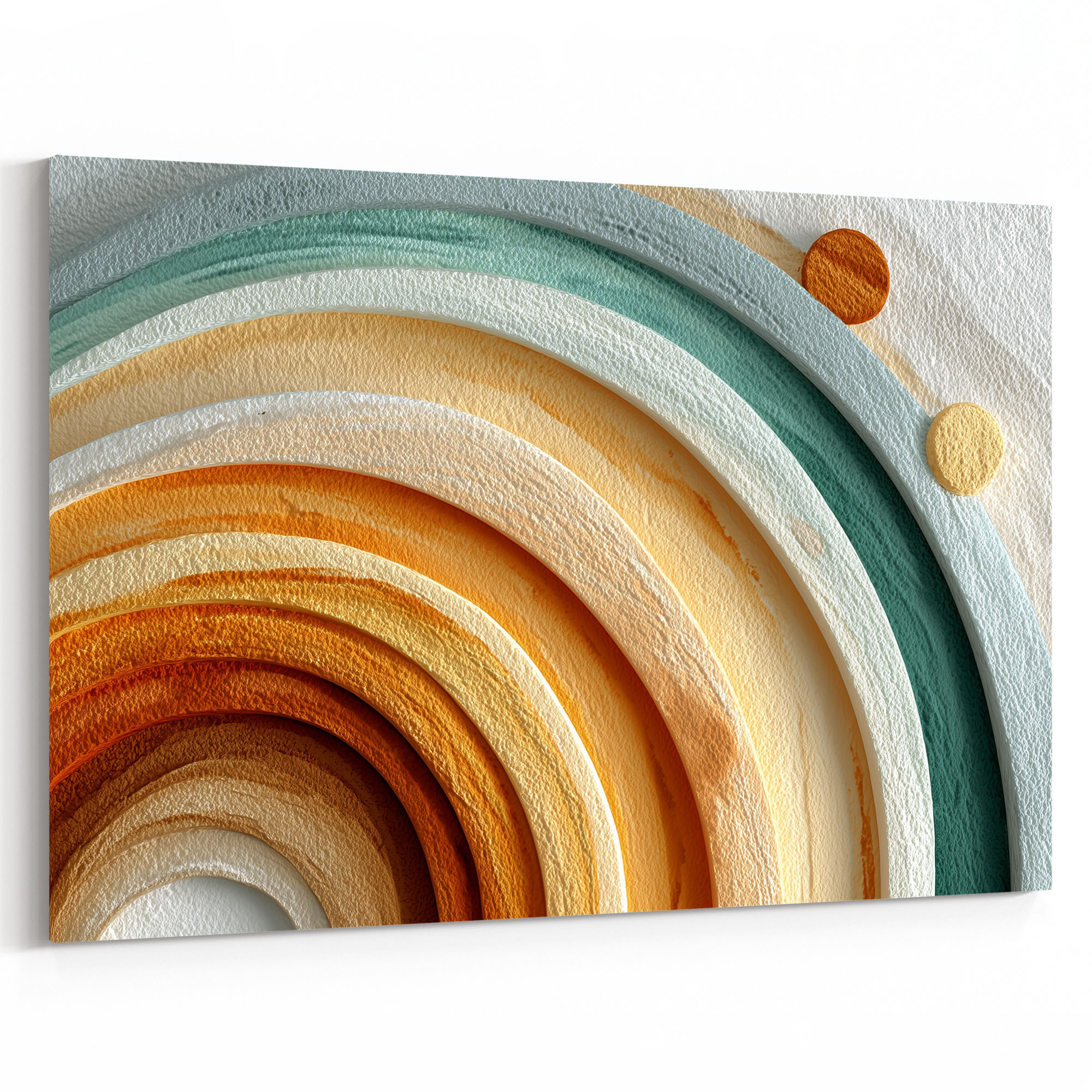 Eine ungewöhnlich ruhige und meditative abstrakte Komposition zeigt konzentrische Halbkreisringe, die sich von der rechten Bildmitte nach außen hin aufschichten und eine regenbogenartige Ringstruktur bilden. Die Farben folgen einem warmen Gradient von innen nach außen: Von cremig-weißem Inneren über helles Gelb, warmem Beige, tiefem Orange und Rostbraun bis hin zu einem kühlen Teal an der Außenkante. Die Flächen sind strukturiert und leicht körnig, was sie materiell und physisch erscheinen lässt – fast wie echte Holz- oder Filzringe in einem dekonstruierten Regenbogenobjekt. Die gesamte Komposition ist horizontal zentriert und strahlt eine bemerkenswerte Ausgeglichenheit und Ruhe aus. Der schlichte weiße Hintergrund lässt die Ringstruktur frei schweben und betont ihre plastische Qualität. Ideal für minimalistische, naturnahe Interieurs, die Warmherzigkeit mit moderner Formensprache verbinden.