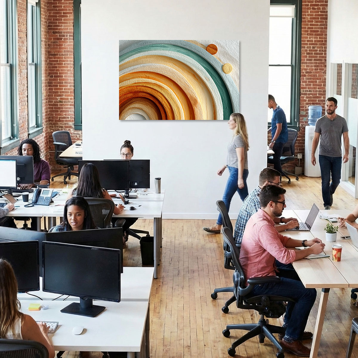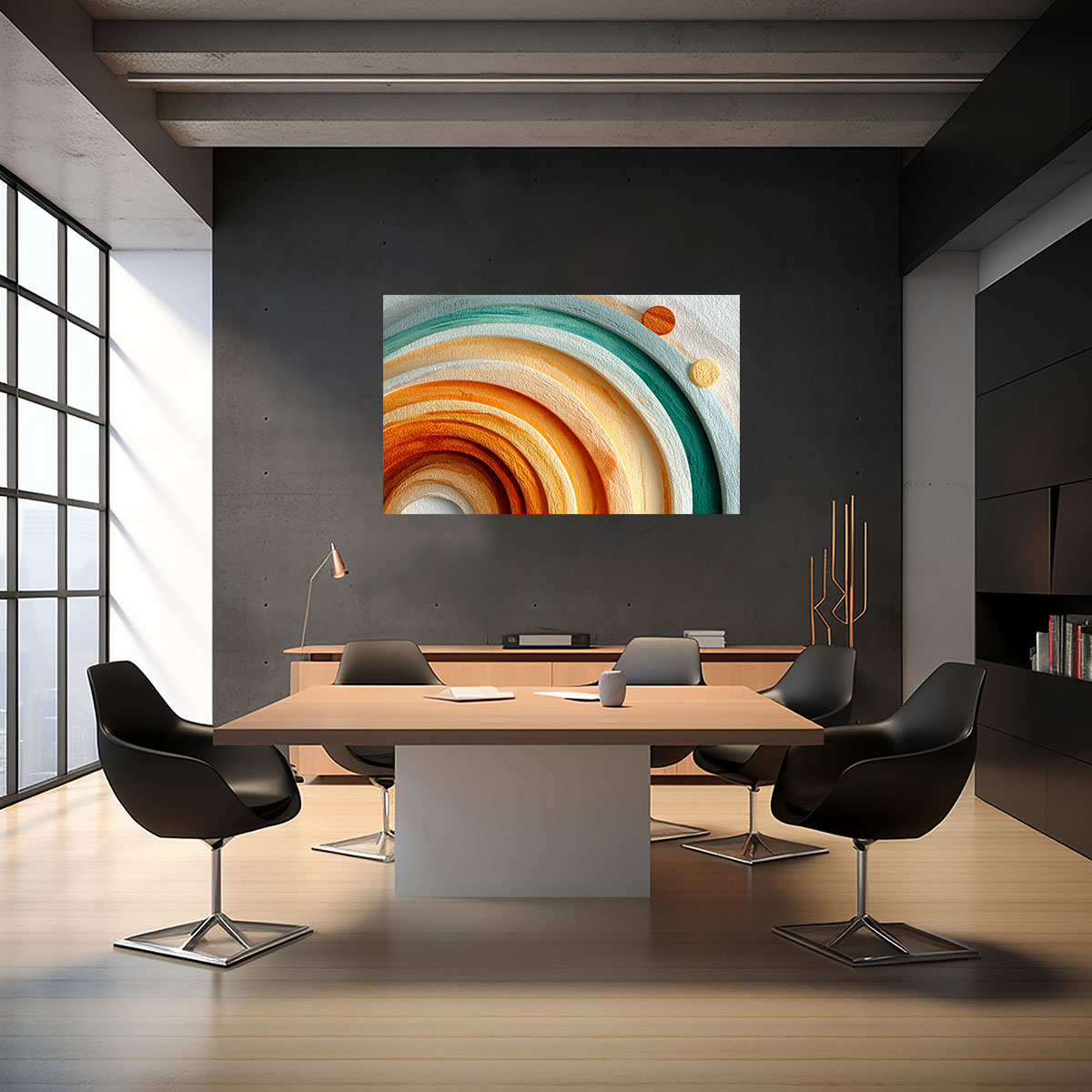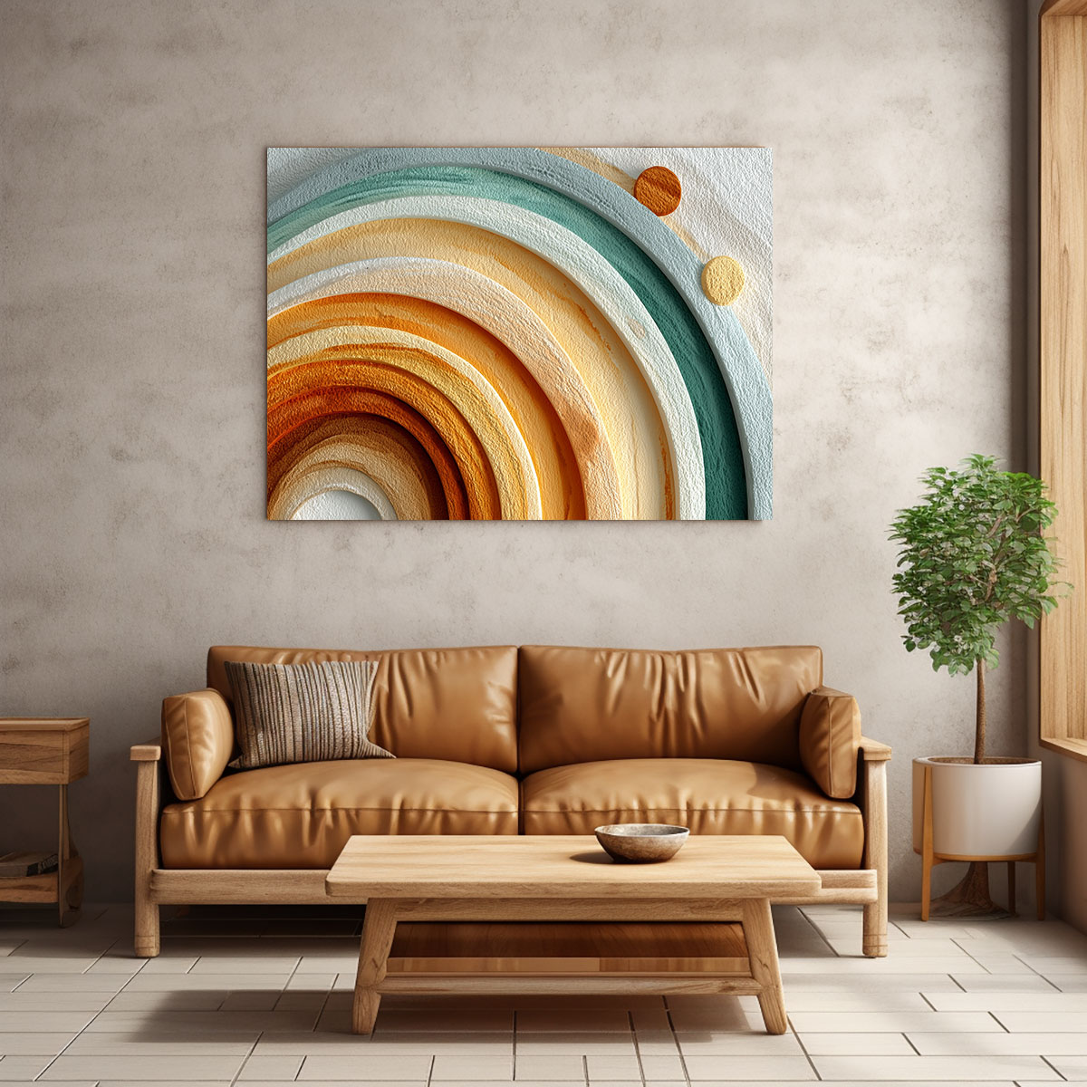 Konzentrische Halbkreisringe in Erdtönen und Teal als ruhige minimalistische Bogenskulptur