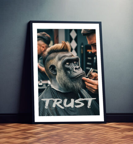 15,90 € – 26,90 €Gorilla beim Barber “Trust” Poster Exklusive Wandkunst für Wohnzimmer, Schlafzimmer, Büro