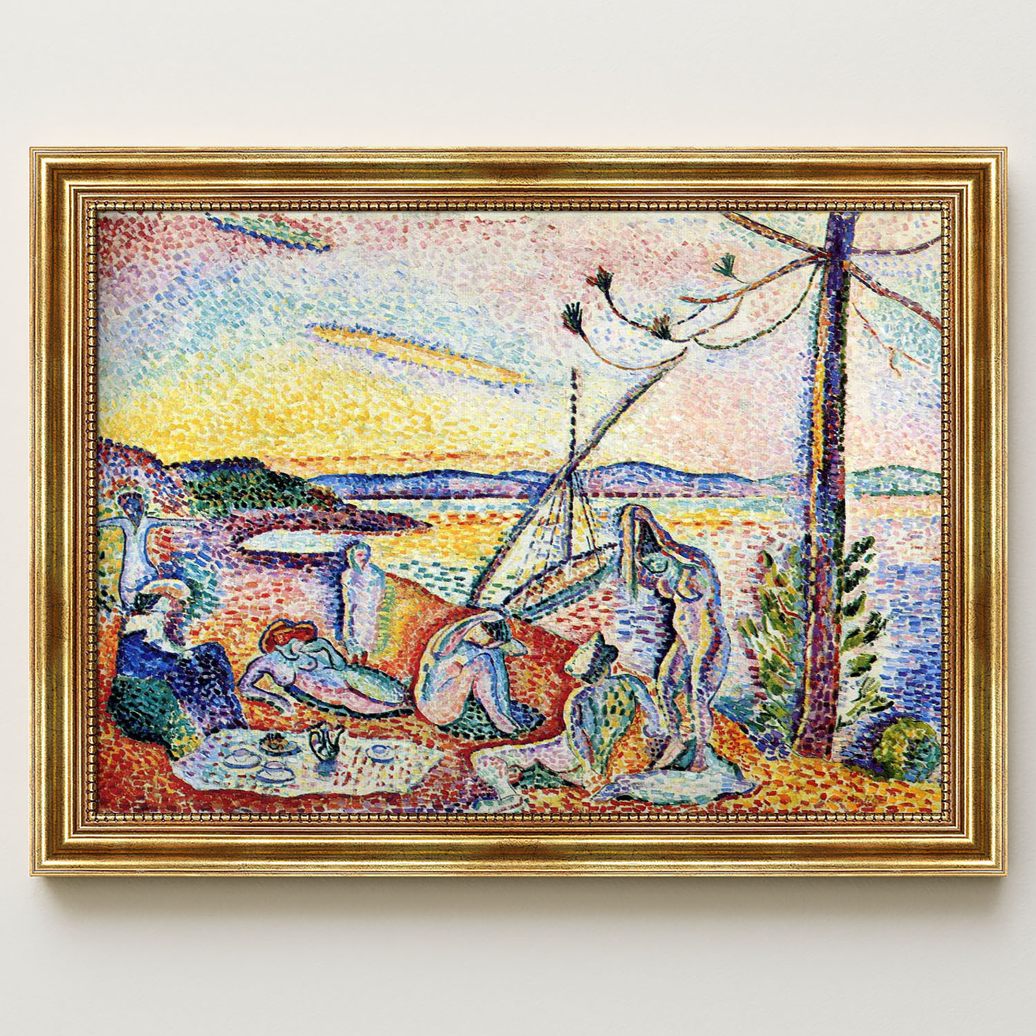 Dieses gerahmte Leinwandbild zeigt Henri Matisses “Luxe, Calme et Volupté” aus dem Jahr 1904, ein Schlüsselwerk des Pointillismus und eine Vorwegnahme des Fauvismus. Es stellt eine idyllische Szene am Meer dar, inspiriert von Charles Baudelaires Gedicht “L’Invitation au voyage”.
