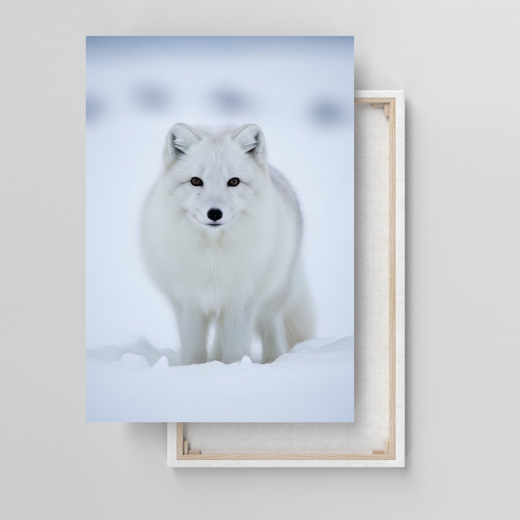 Dieses hochformatige Leinwandbild fängt die stille Majestät des Polarfuchses ein, der aufmerksam im Schnee steht. Die weichen Pastelltöne des Hintergrunds heben das makellose Weiß seines Fells hervor. Es strahlt eine tiefe Ruhe und die unberührte Schönheit der arktischen Wildnis aus.