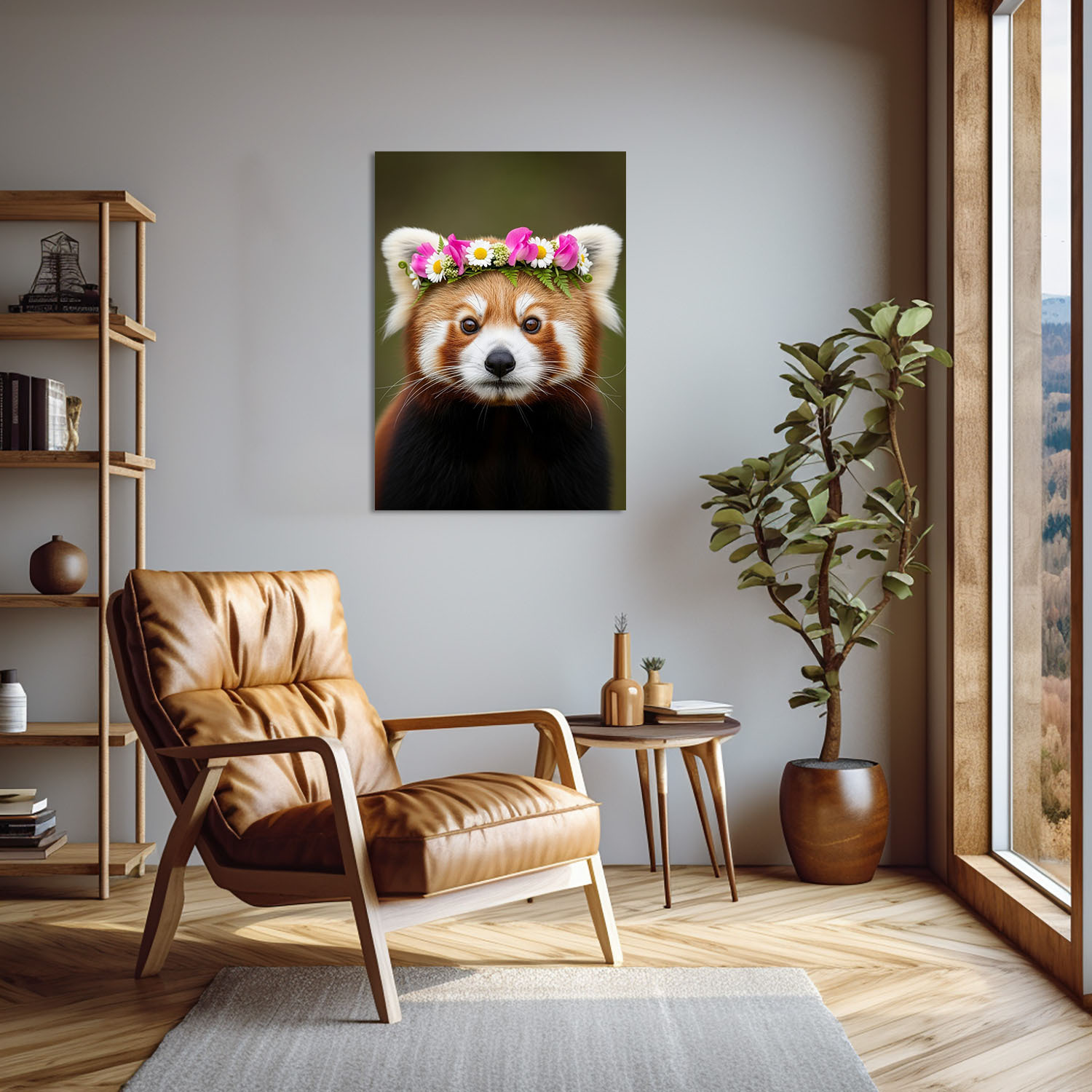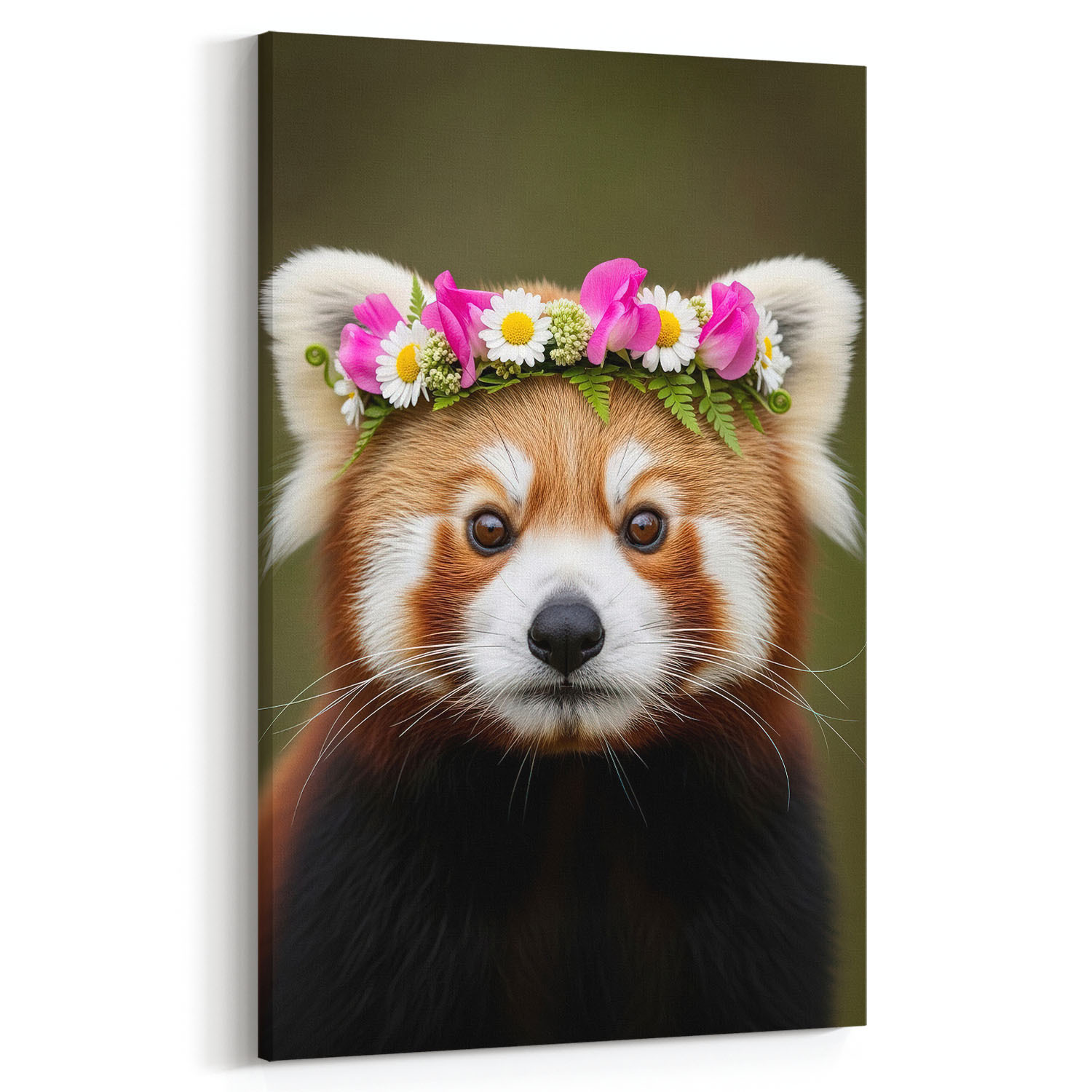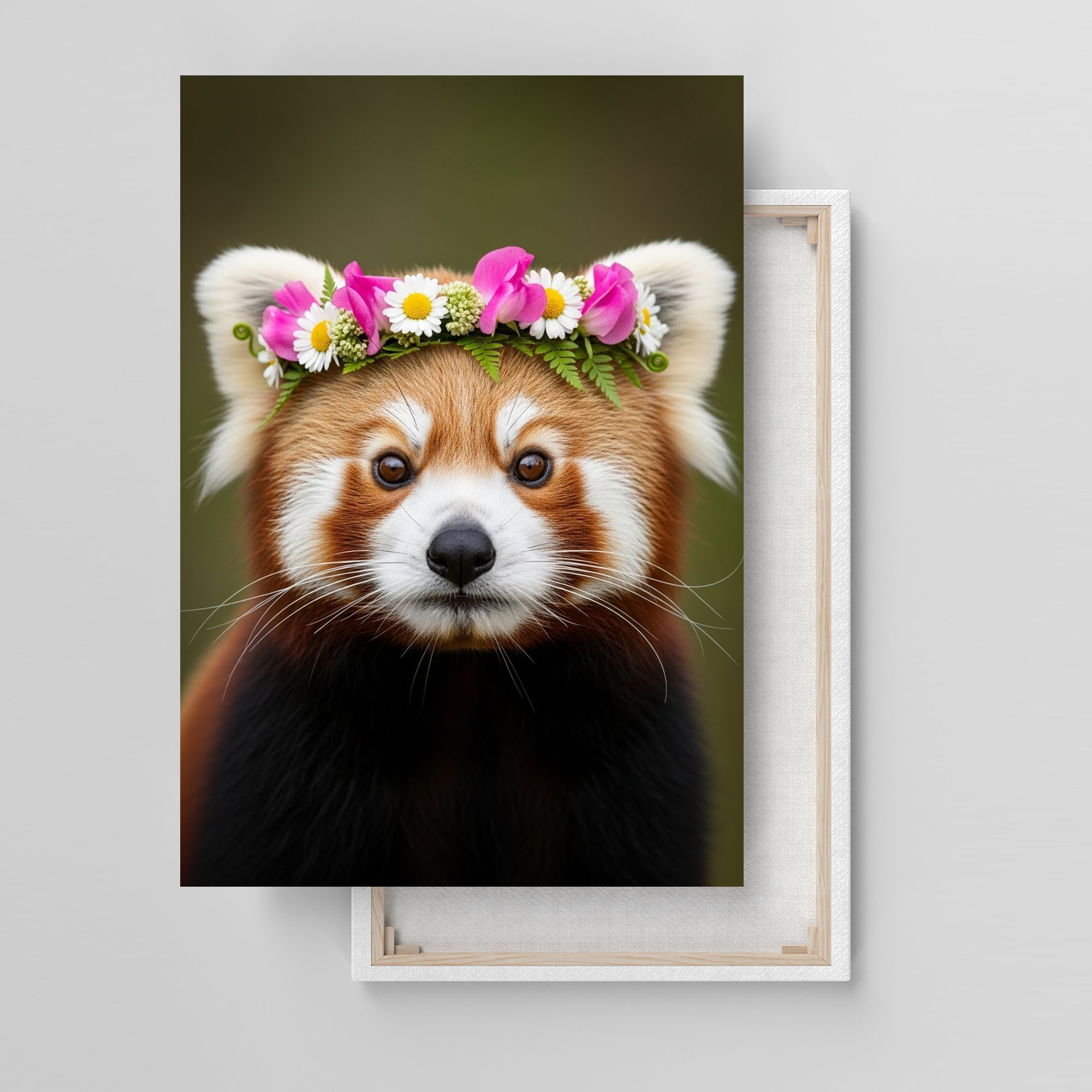 Dieses bezaubernde Leinwandbild fängt das detailreiche und neugierige Gesicht eines Roten Pandas ein. Sein charakteristisches rotbraunes Fell und die weißen Gesichtszeichnungen werden durch einen sanften, verschwommenen Waldhintergrund hervorgehoben.