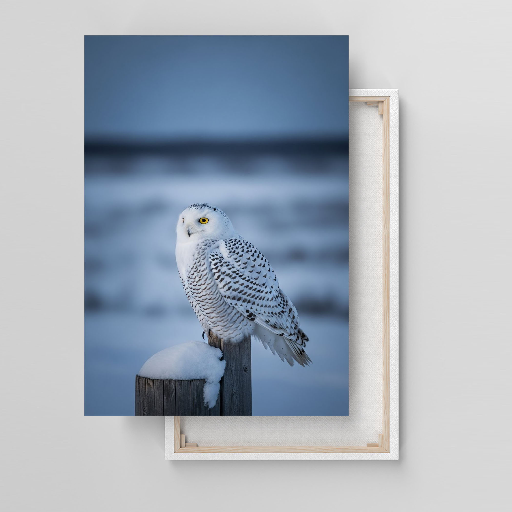 Dieses faszinierende Leinwandbild fängt die majestätische Präsenz der Schneeeule (Snowy Owl) in ihrer natürlichen, frostigen Umgebung ein. Die Eule sitzt stolz auf einem verschneiten Holzpfahl und blickt mit ihren durchdringenden, leuchtend gelben Augen direkt aus dem Bild.