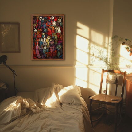 Dieser wunderschöne Kunstdruck zeigt eine schwarze Katze, die zwischen leuchtenden Wildblumen sitzt. Perfekt für Kunstliebhaber und Katzenliebhaber, die atemberaubende, farbenfrohe Designs schätzen.
