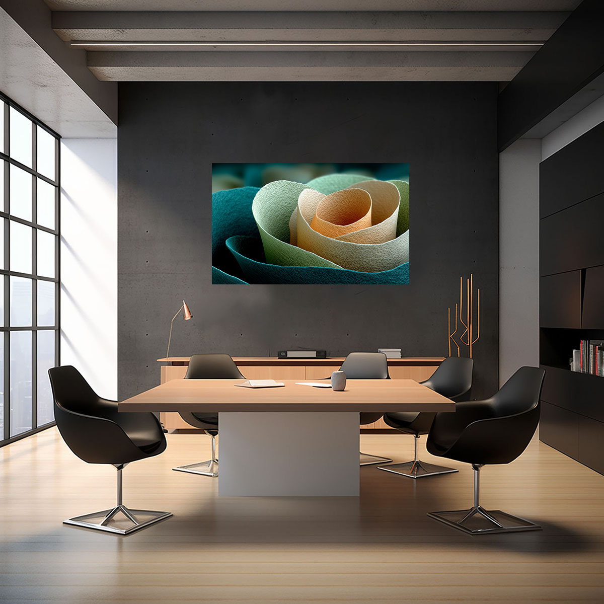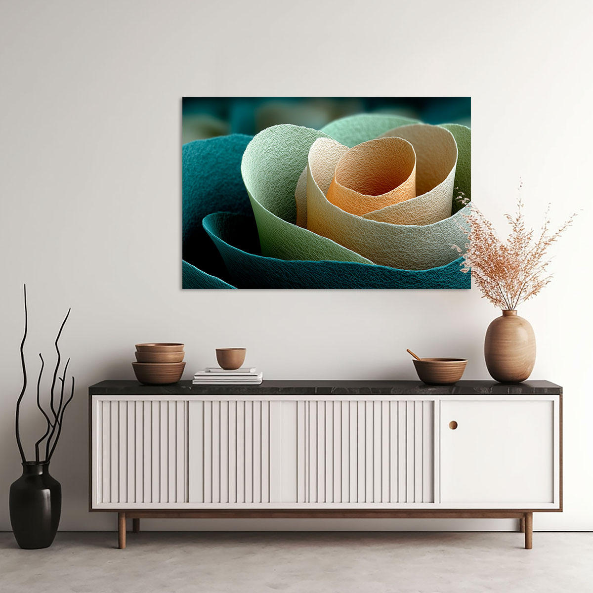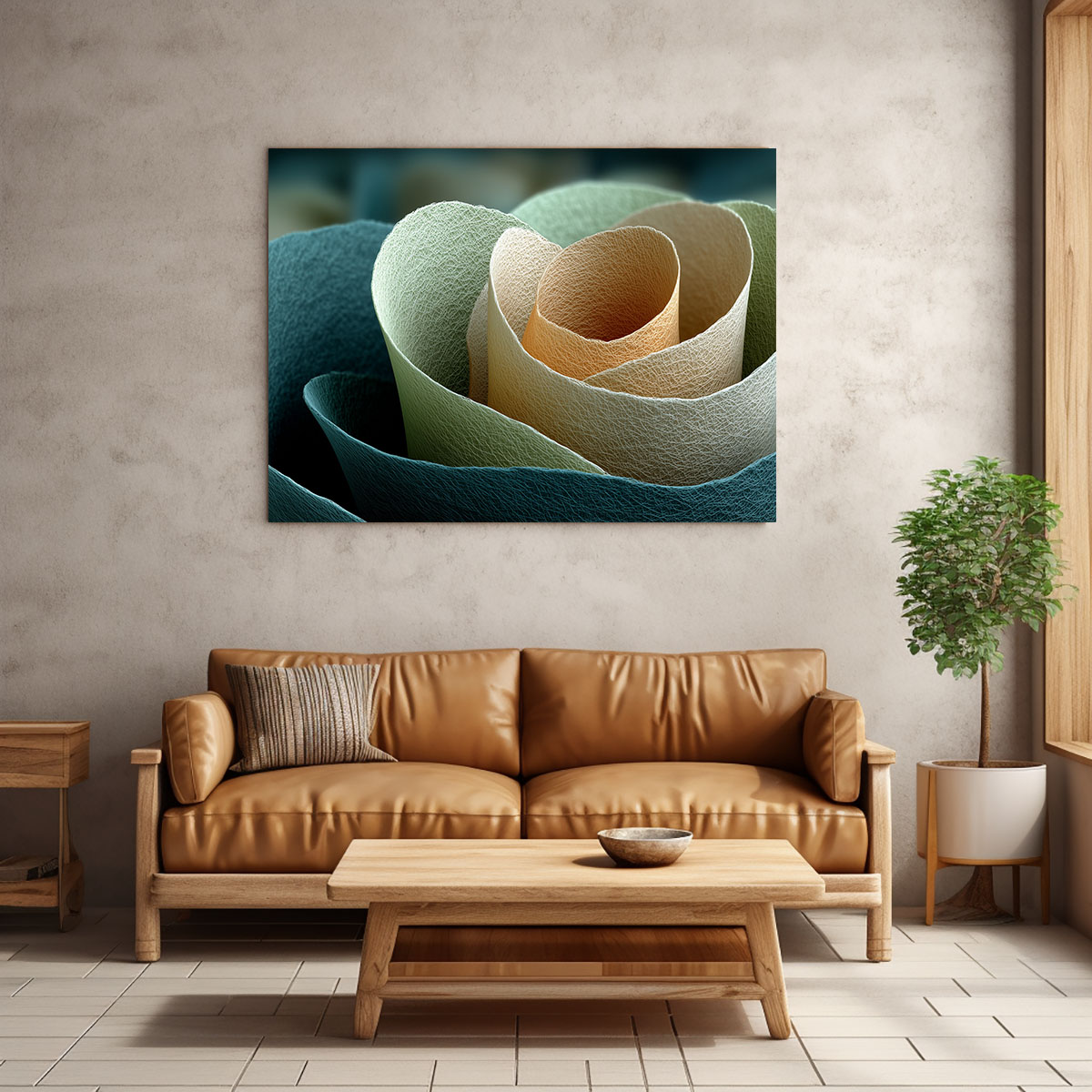 Eine ungewöhnlich ruhige, minimalistische Komposition zeigt aufgerollte Materialbahnen – sie könnten aus Papier, Leder oder Filz bestehen – in zartem Salbeigrün und cremigem Beige. Die Rollen überlagern sich sanft und bilden geschwungene, organische Formen, die wie Blütenblätter oder Muschelschalen wirken. Die Oberfläche des Materials ist fein texturiert und leicht körnig, was dem Bild eine taktile Qualität verleiht. Die gesamte Komposition ist in einer extrem reduzierten, ruhigen Farbpalette gehalten und wirkt wie ein Statement für Minimalismus und handwerkliche Ästhetik. Die weichen Schatten zwischen den Rollen geben dem Bild eine subtile Dreidimensionalität. Kein harter Kontrast, kein Drama – nur eine stille, textile Ruhe, die den Betrachter zur Langsamkeit einlädt. Ideal für minimalistische, natürlich gestaltete Räume, die organische Formen und textile Ästhetik schätzen.