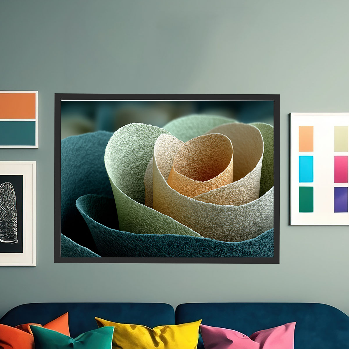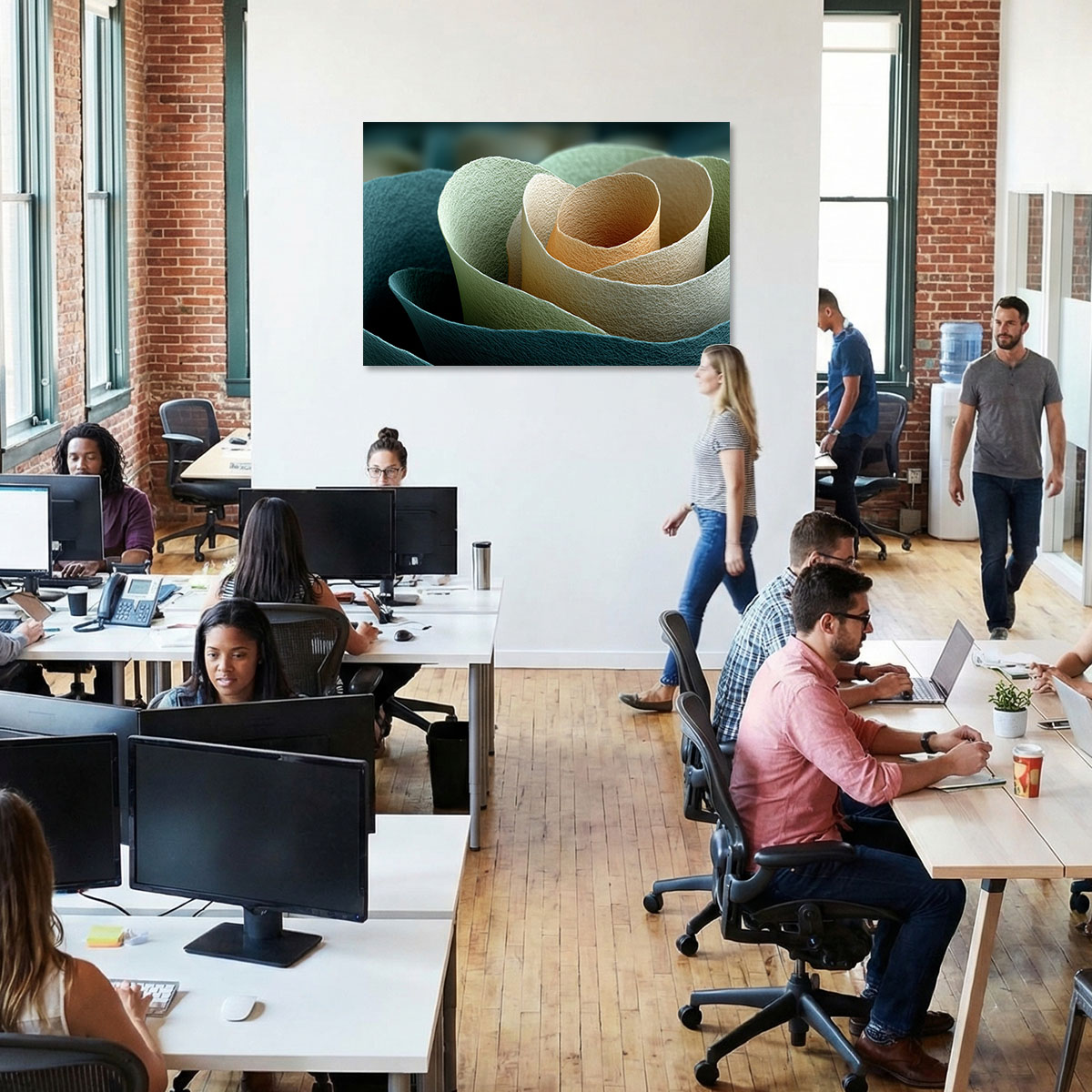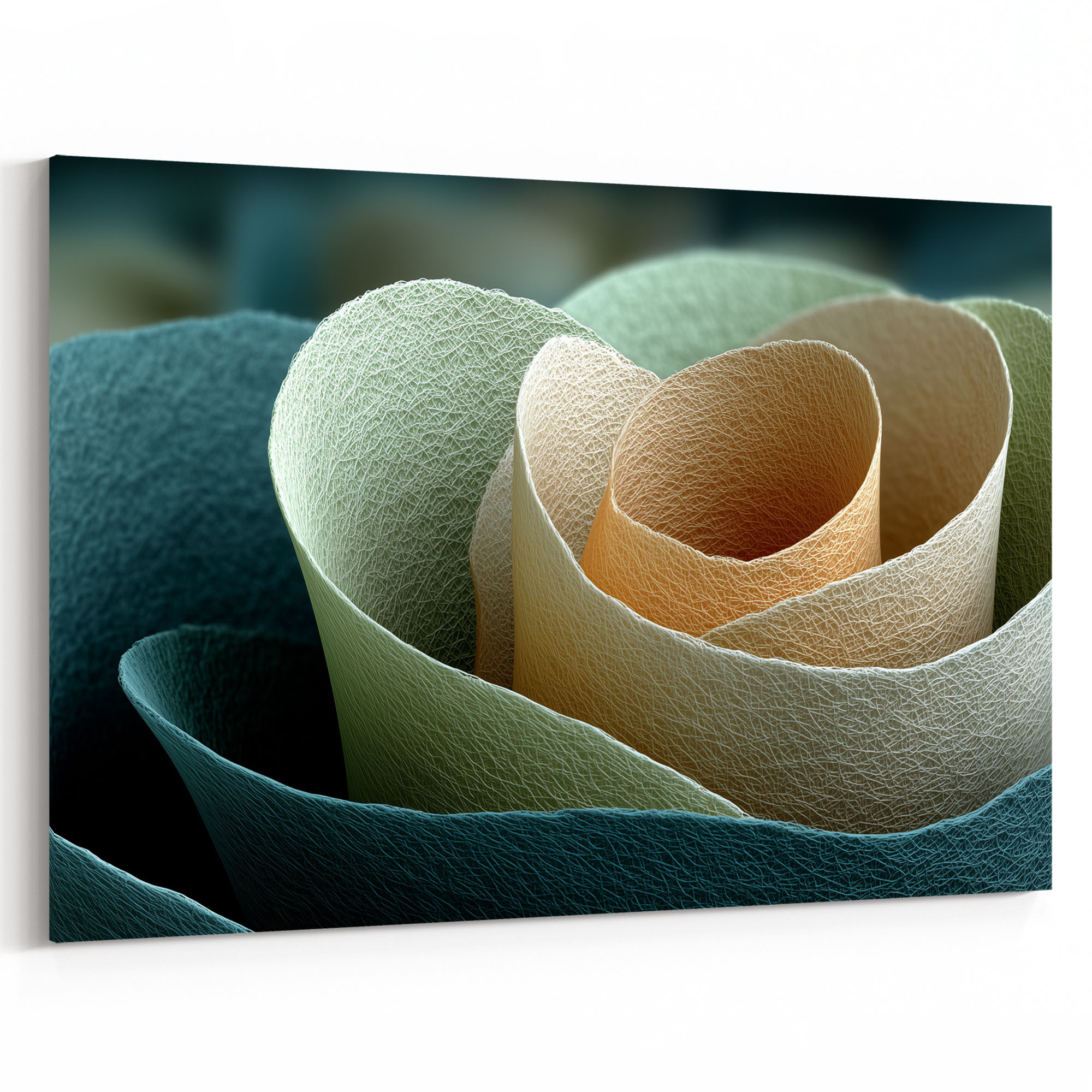 Eine ungewöhnlich ruhige, minimalistische Komposition zeigt aufgerollte Materialbahnen – sie könnten aus Papier, Leder oder Filz bestehen – in zartem Salbeigrün und cremigem Beige. Die Rollen überlagern sich sanft und bilden geschwungene, organische Formen, die wie Blütenblätter oder Muschelschalen wirken. Die Oberfläche des Materials ist fein texturiert und leicht körnig, was dem Bild eine taktile Qualität verleiht. Die gesamte Komposition ist in einer extrem reduzierten, ruhigen Farbpalette gehalten und wirkt wie ein Statement für Minimalismus und handwerkliche Ästhetik. Die weichen Schatten zwischen den Rollen geben dem Bild eine subtile Dreidimensionalität. Kein harter Kontrast, kein Drama – nur eine stille, textile Ruhe, die den Betrachter zur Langsamkeit einlädt. Ideal für minimalistische, natürlich gestaltete Räume, die organische Formen und textile Ästhetik schätzen.