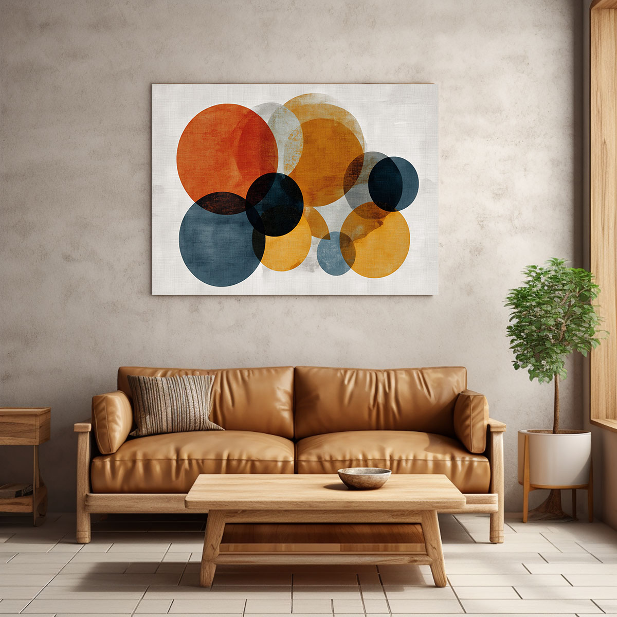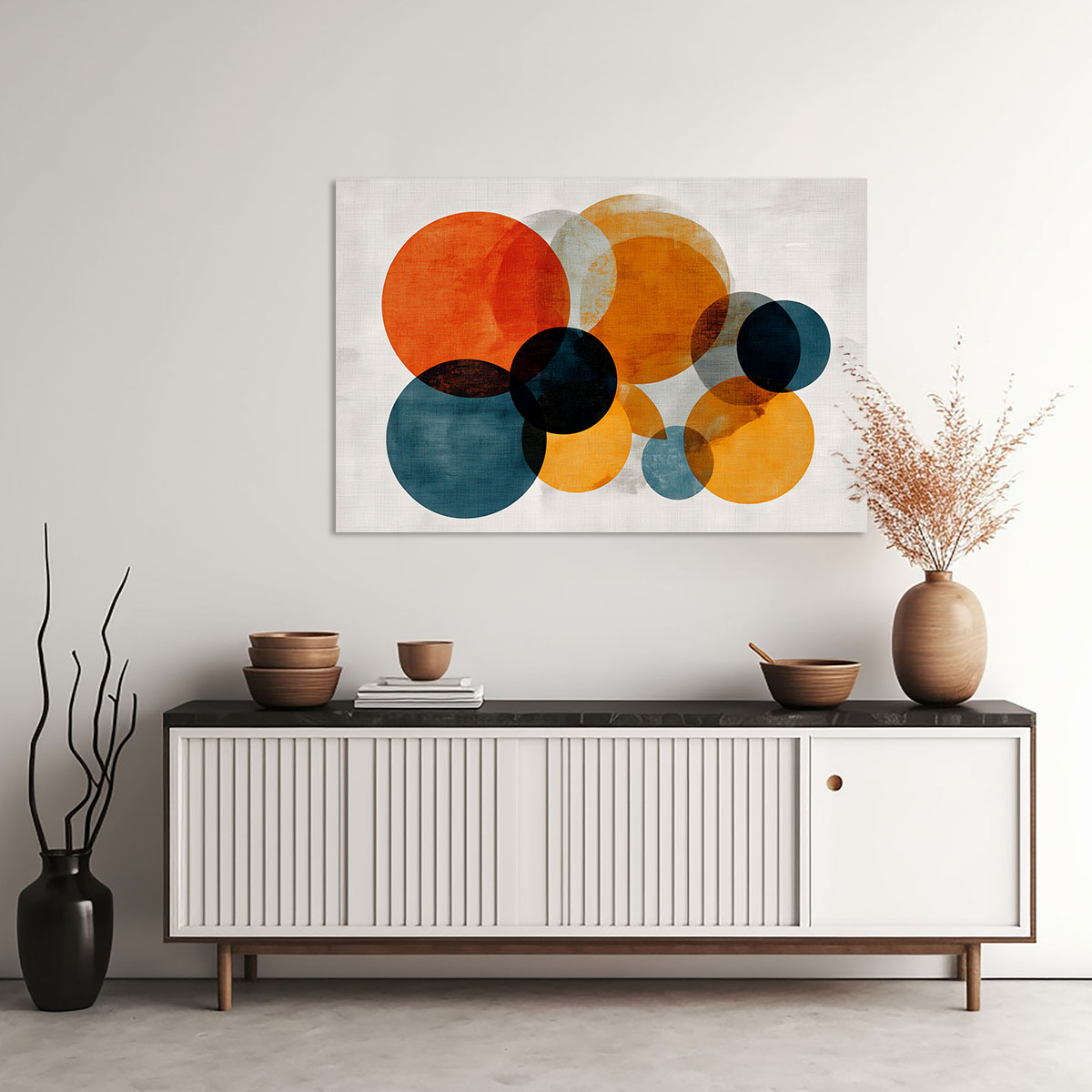 Eine lebhafte, energetische Komposition aus Kreisen unterschiedlicher Größe verteilt sich über den hellen Hintergrund wie Planeten in einem eigenen kleinen Universum. Im Gegensatz zu dichter gestalteten Variationen wirkt diese Anordnung luftiger und spielerischer – die Kreise haben mehr Raum um sich und treten in einen lebendigen Dialog miteinander. Die Farbpalette umfasst leuchtendes Orange, tiefes Ziegelrot, warmes Ocker und kühles Petrol, ergänzt durch fast schwarze Überschneidungsflächen, die dem Werk visuelle Tiefe verleihen. Größere Kreise dominieren die Mitte und den oberen Bildbereich, während kleinere Formen die Komposition nach unten hin abschließen. Der strukturierte, textile Hintergrund fügt eine handwerkliche Note hinzu und macht das Bild trotz seiner abstrakten Natur warm und einladend. Ein Statement-Piece für moderne Wohnräume, das Farbe und Form mit Freude und Leichtigkeit verbindet.