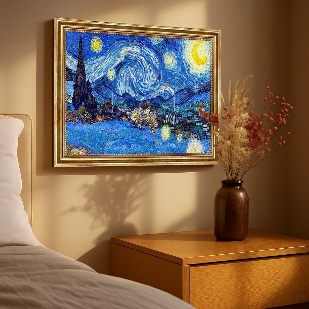 Das Gemälde zeigt “Die Sternennacht” von Vincent van Gogh, gemalt im Juni 1889. Es ist eine ikonische Darstellung eines Nachthimmels über einem schlafenden Dorf.