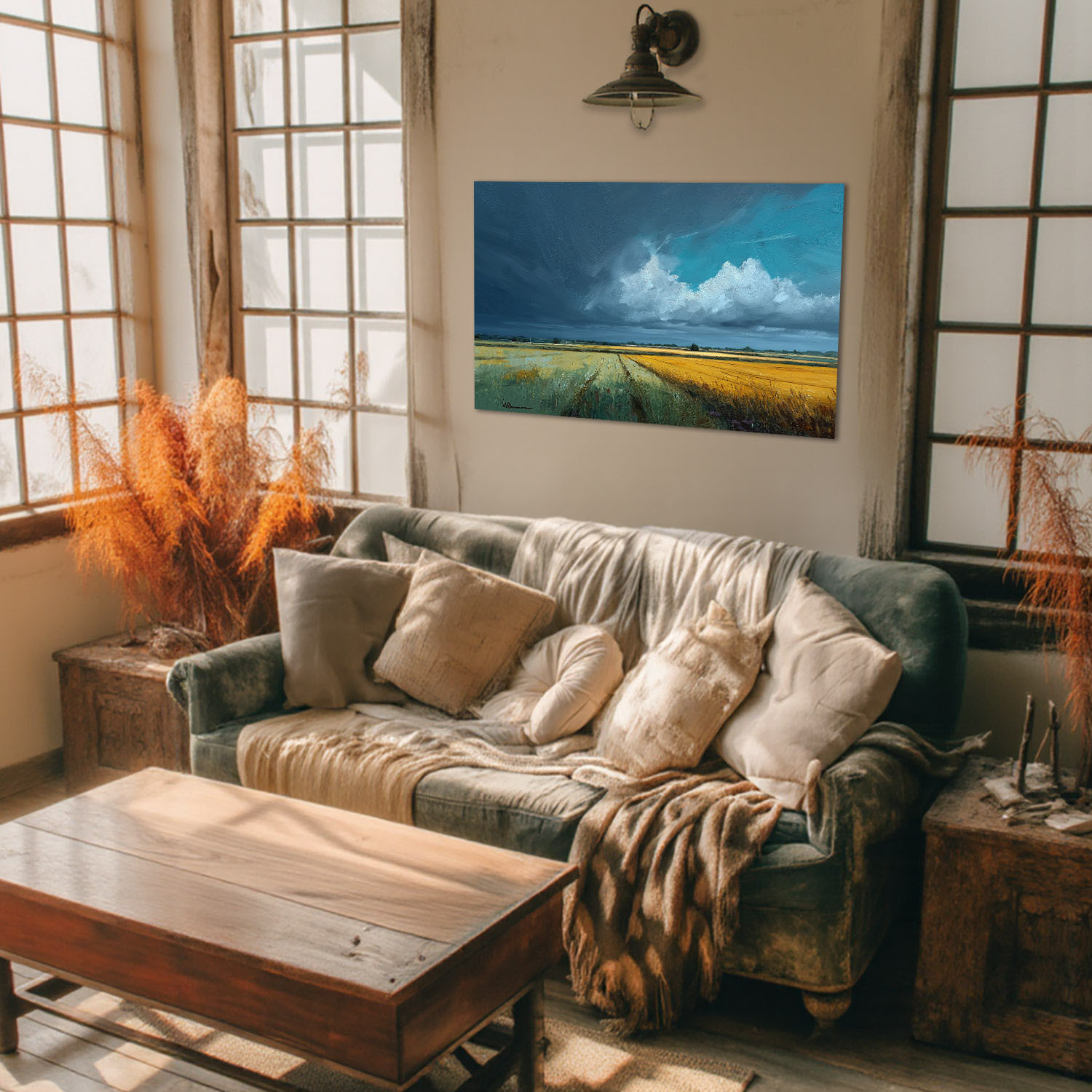 Dieses ausdrucksstarke Leinwandbild zeigt eine weite Landschaft unter einem dramatischen Himmel, der eine kraftvolle Stimmung einfängt. Der obere Teil des Bildes wird von dunklen, stürmischen Wolken dominiert, die in einem tiefen Blau-Grau gehalten sind und einen starken Kontrast zu den leuchtenden Himmelsabschnitten in Türkis und Weiß bilden.