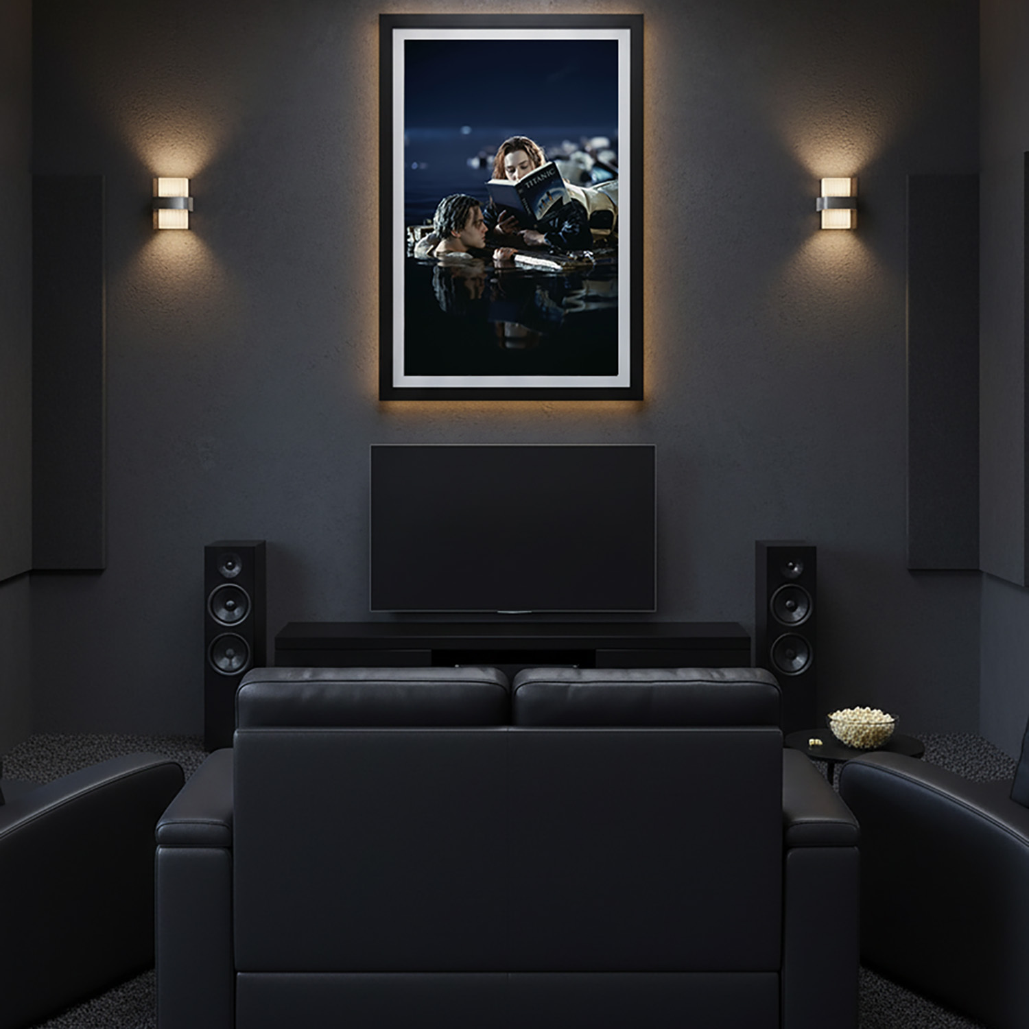 Dieses eindrucksvolle Poster fängt eine ergreifende Szene aus James Camerons epischem Liebesfilm „Titanic“ von 1997 ein. Es zeigt die beiden Hauptfiguren, Jack Dawson (gespielt von Leonardo DiCaprio) und Rose DeWitt Bukater (gespielt von Kate Winslet), die nach dem Untergang des Schiffes im eiskalten Atlantik treiben.