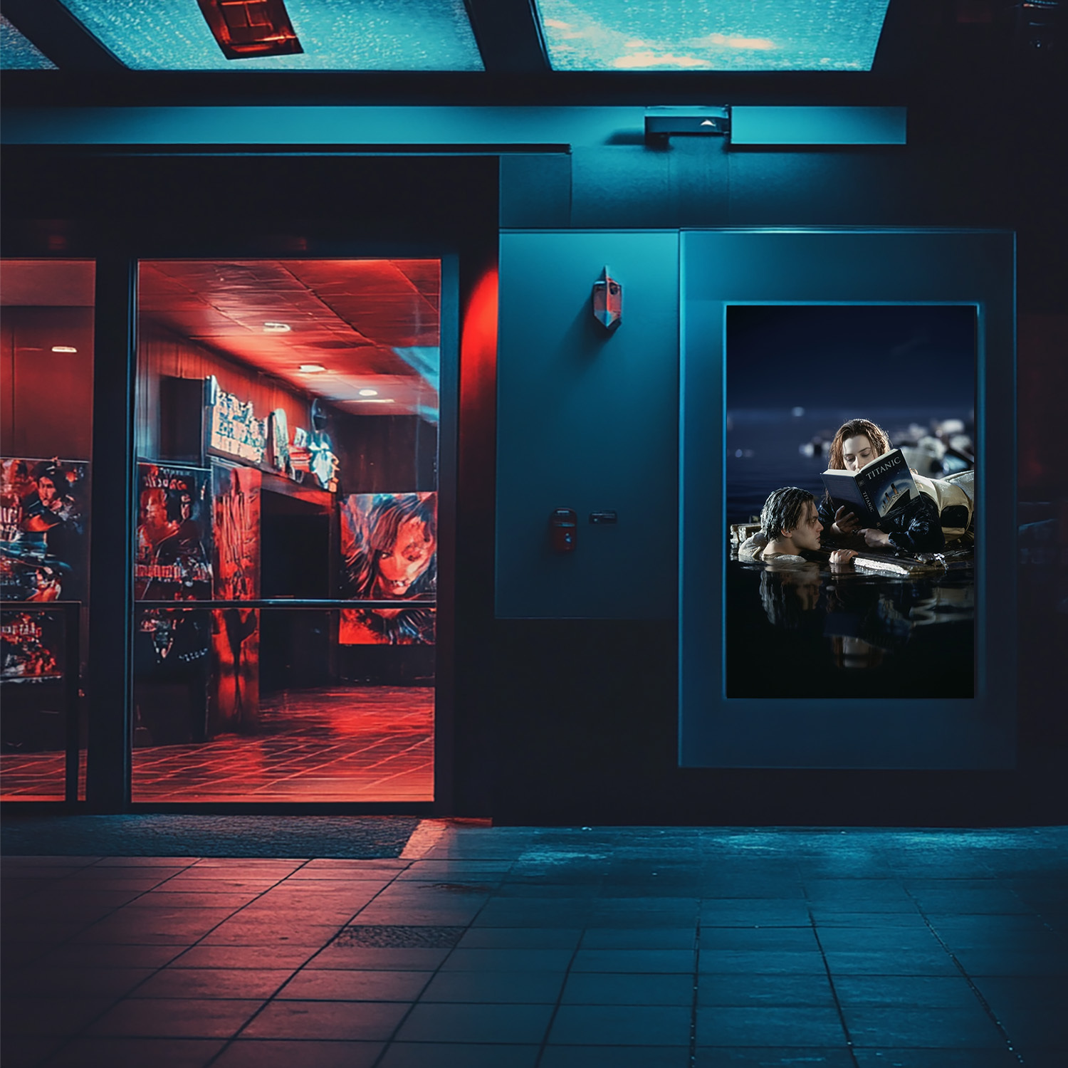 Rose blickt auf ein offenes Buch, auf dessen Einband deutlich das Wort „TITANIC“ zu lesen ist – eine ironische Inszenierung der Filmemacher. Die Szene spielt unter einem dunklen Sternenhimmel und unterstreicht so ihre Isolation und die tragischen Umstände. Dieses Bild fängt auf wunderschöne Weise ihren verzweifelten Überlebenskampf und ihre tiefe Verbundenheit ein.