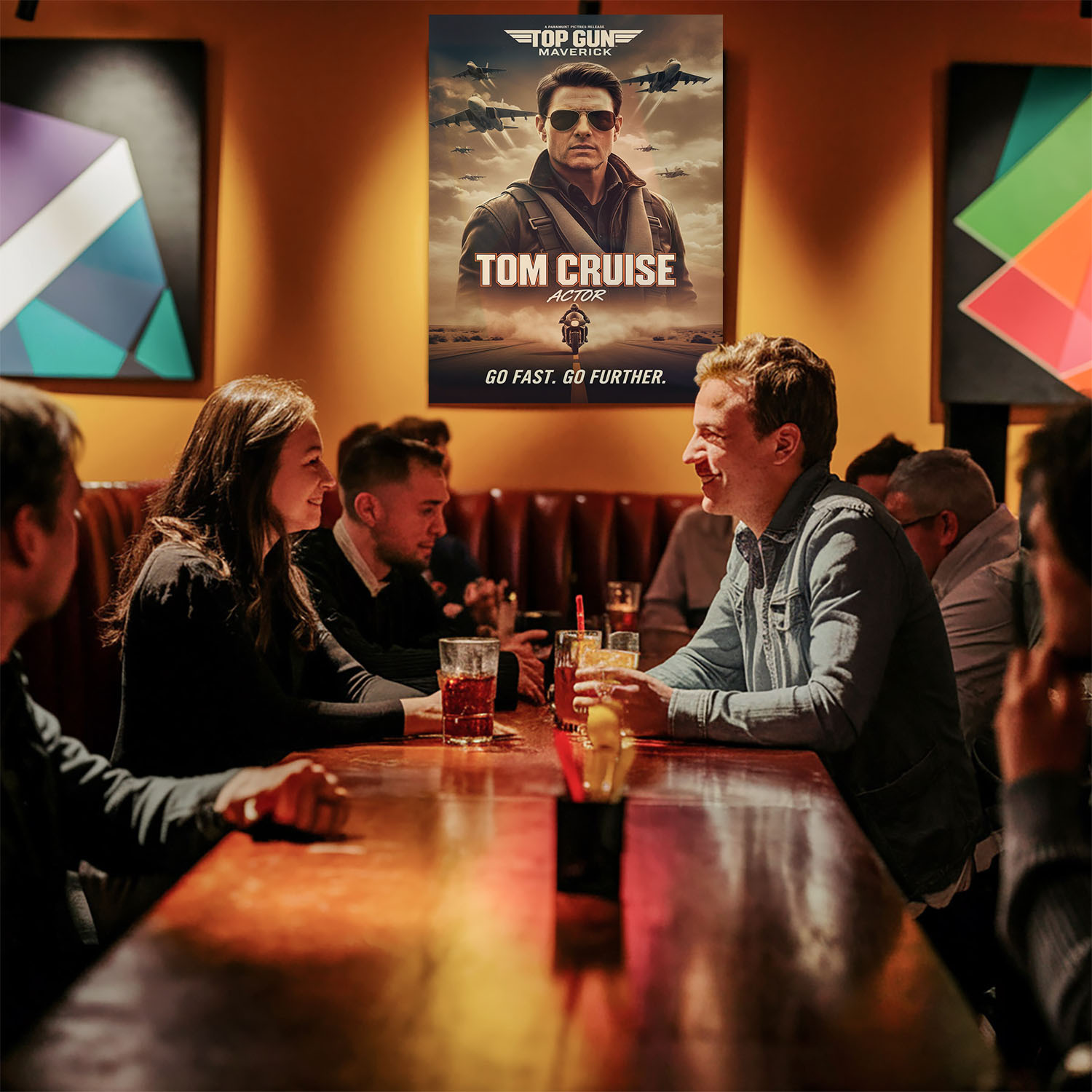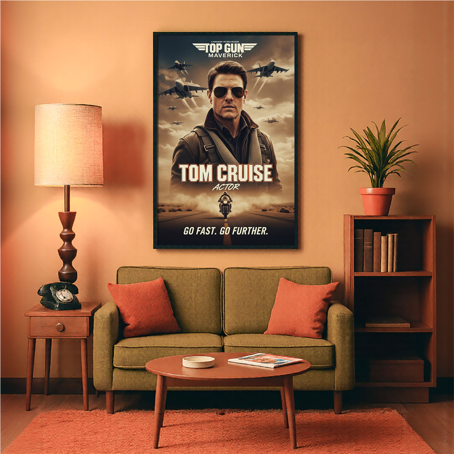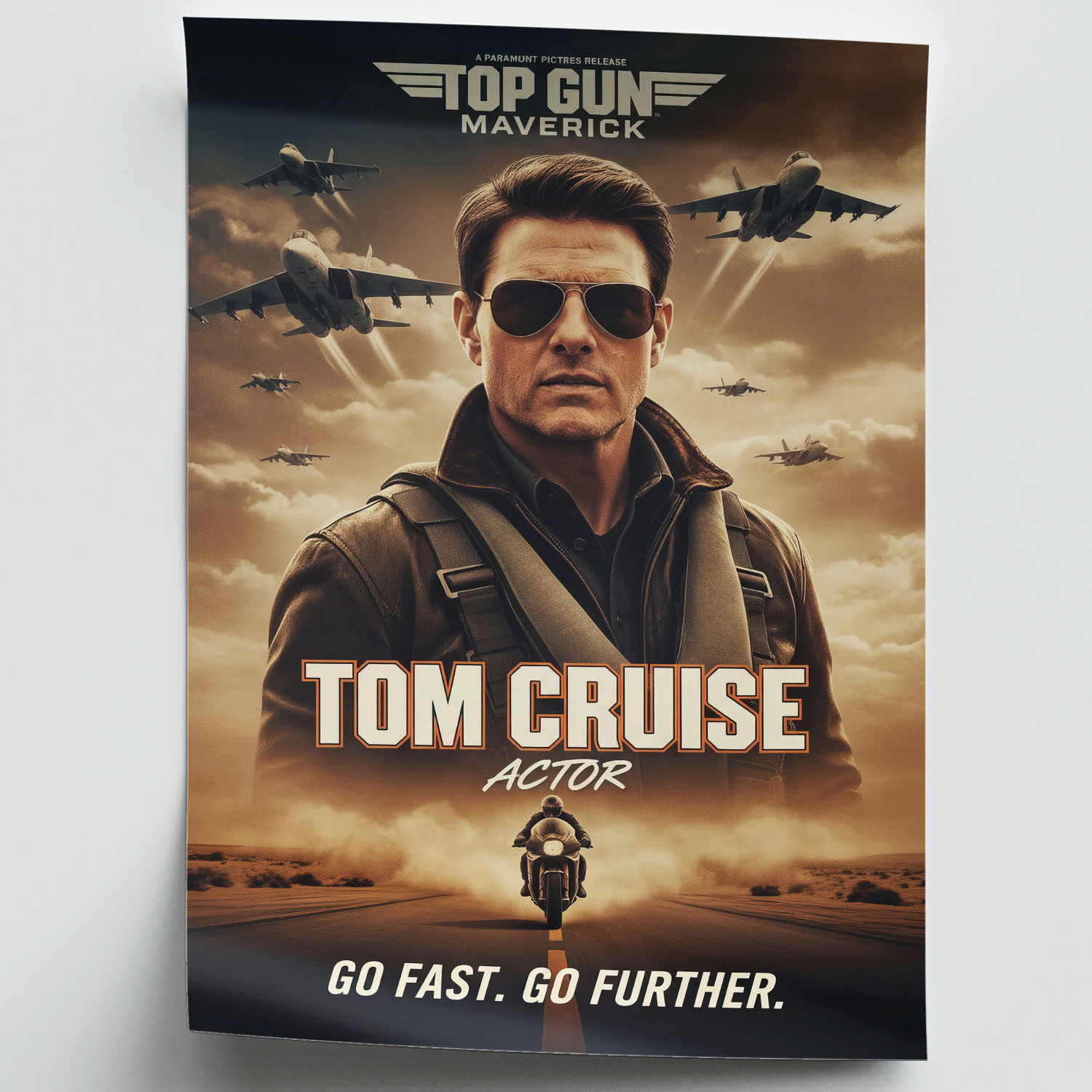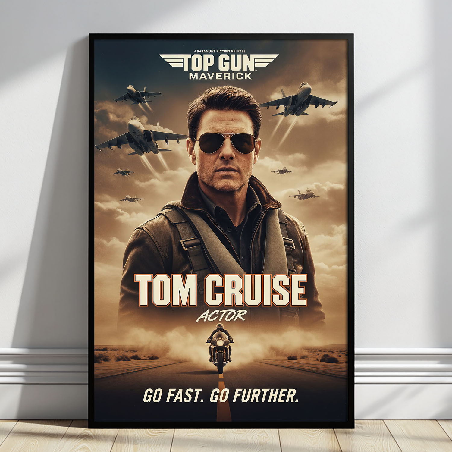 At the top, the logo for “TOP GUN MAVERICK” is prominently displayed. Below the portrait, the text “TOM CRUISE ACTOR” is shown in large, bold lettering. A small image of a motorcycle rider speeding down an empty desert highway sits just above the final, bold tagline at the bottom: “GO FAST. GO FURTHER.” The poster effectively captures the film’s high-octane, adventurous spirit.
