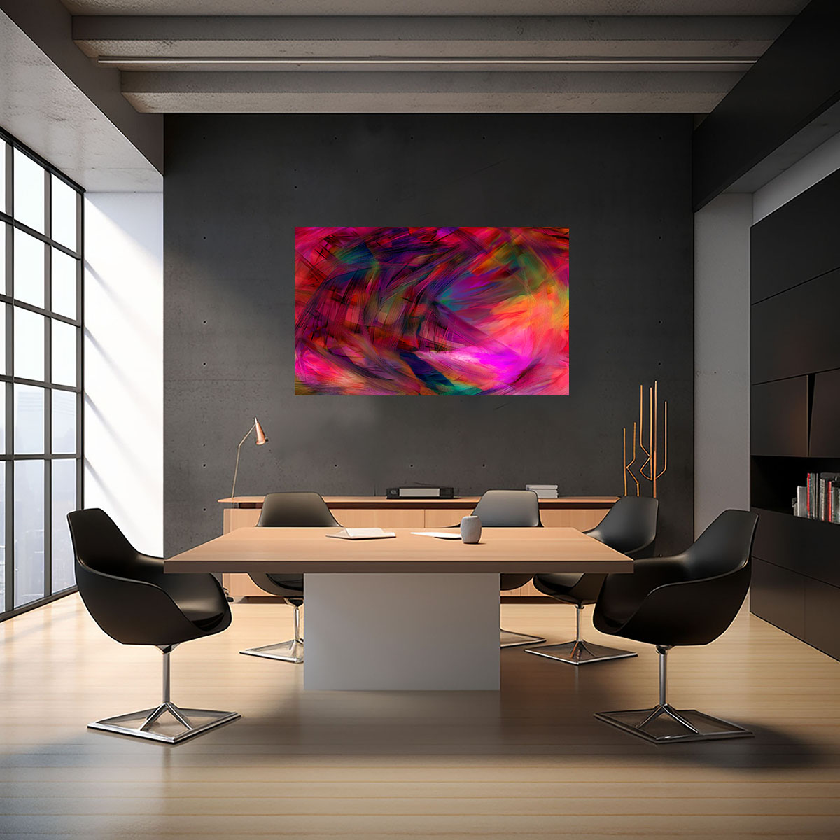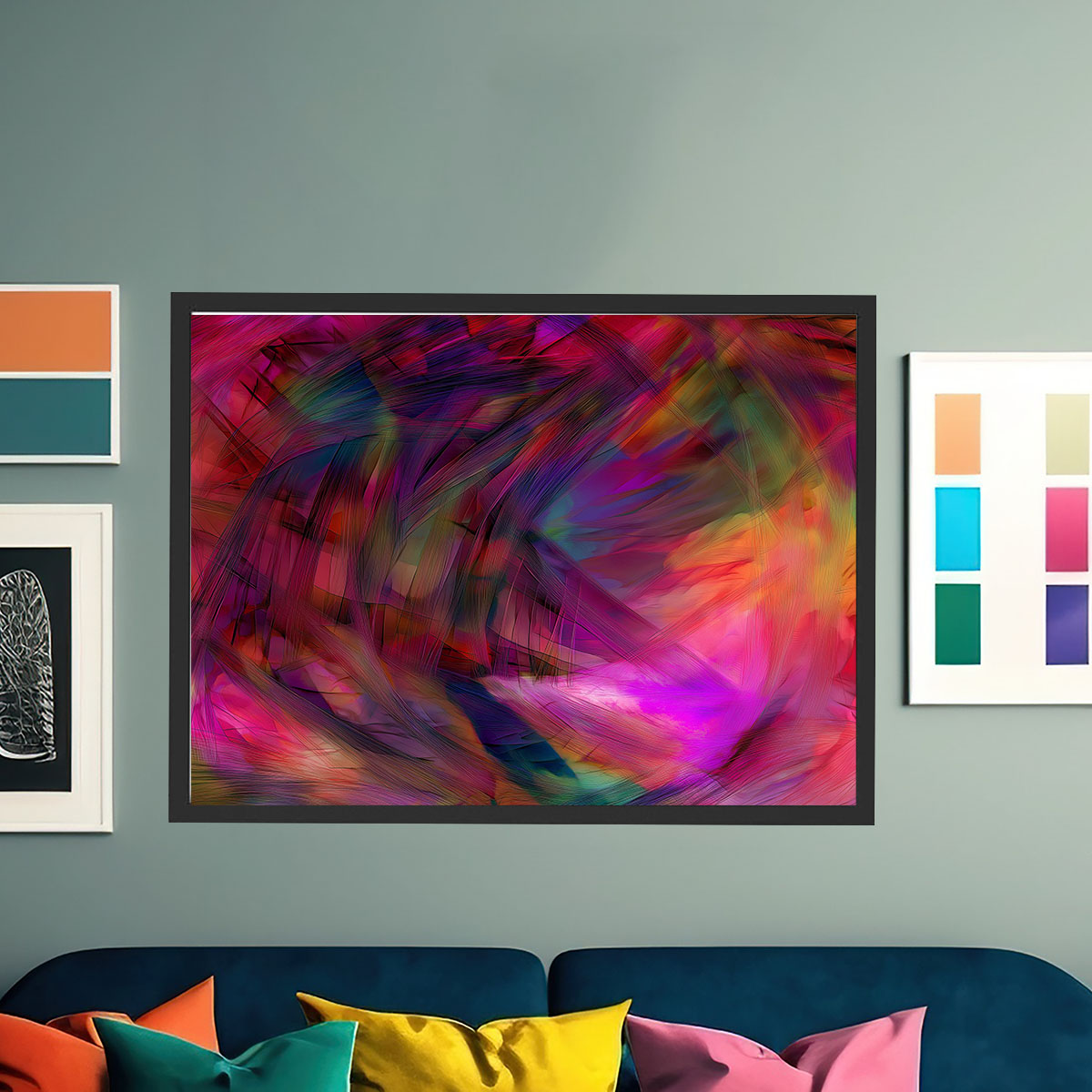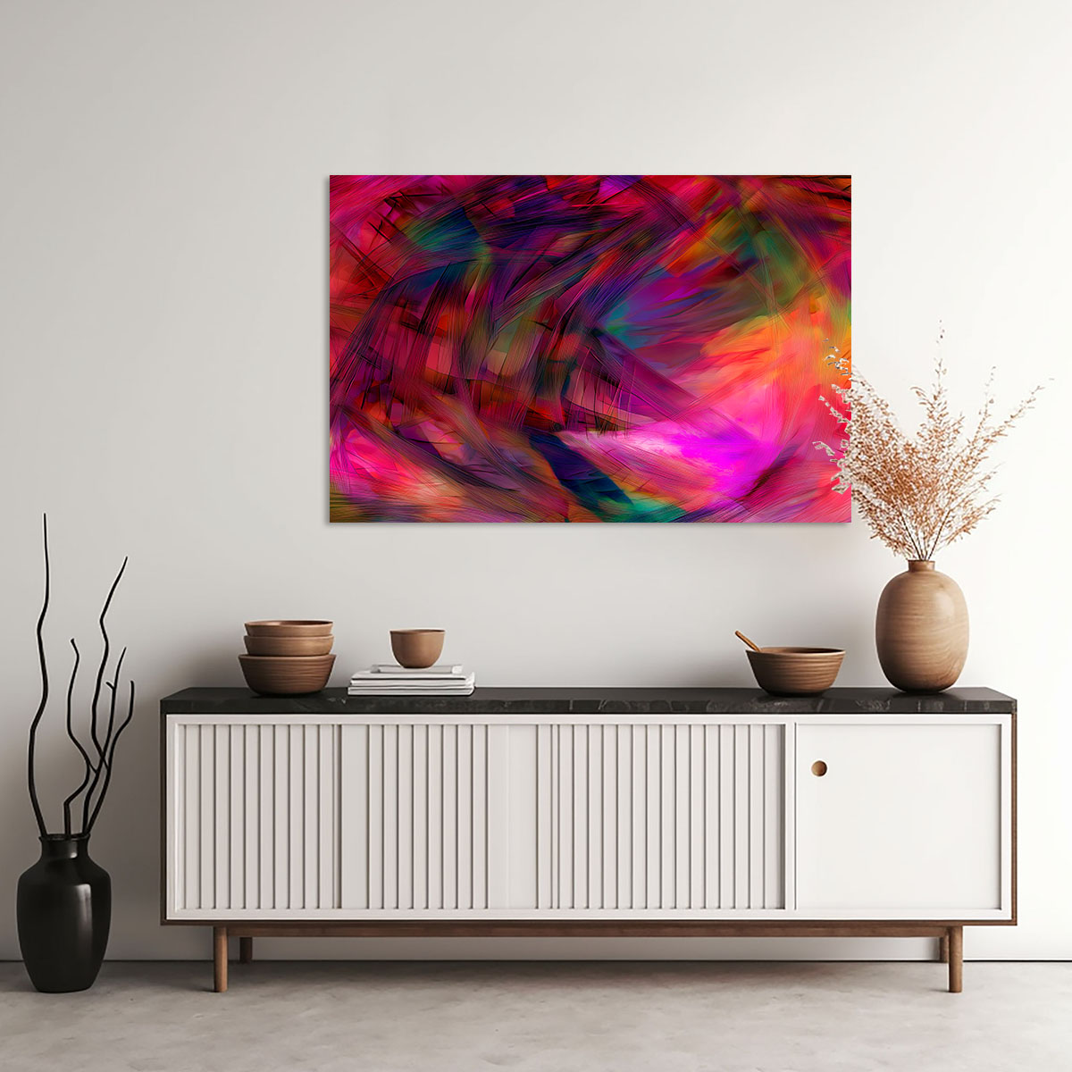 Ein leuchtendes, fast psychedelisches Farbenspektakel entfaltet sich in diesem Bild, das an die Energie von Tanzbewegungen oder die Visualisierung von Musik erinnert. Breite, fließende Farbflächen in intensivem Magenta, leuchtendem Pink, tiefem Türkis und kühlem Blau überlagern sich in wirbelnden Bewegungen und erzeugen eine Tiefe, die den Blick in immer neue Schichten zieht. Transparente Schleier aus Farbe liegen übereinander und schaffen durch ihre Überlagerung neue, unerwartete Töne an den Berührungspunkten. Dunkle Konturen und Linien durchziehen die Komposition und geben der sonst amorphen Farbigkeit eine grafische Struktur. Das Bild hat eine außergewöhnliche Leuchtqualität – die Farben scheinen von innen heraus zu strahlen, als ob Licht dahinter liegen würde. Eine visuelle Erfahrung, die den Betrachter unmittelbar anspricht und in einen emotionalen Zustand versetzt. Ideal als energetisches Statement-Bild für moderne, farbige Interieurs.
