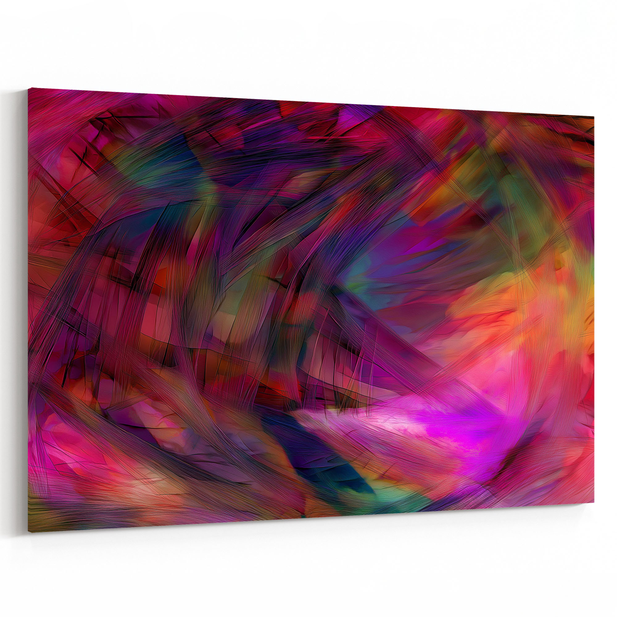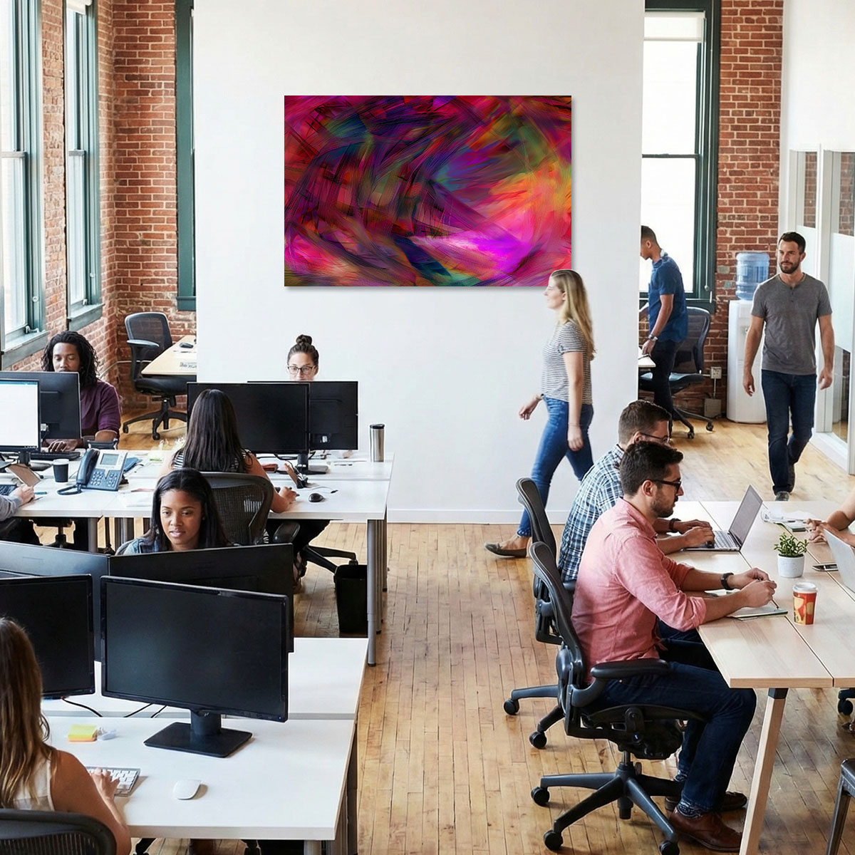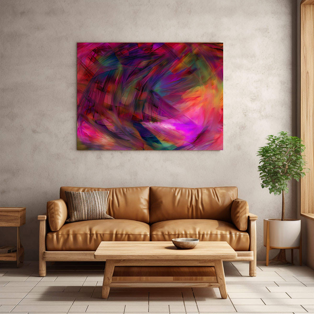Ein leuchtendes, fast psychedelisches Farbenspektakel entfaltet sich in diesem Bild, das an die Energie von Tanzbewegungen oder die Visualisierung von Musik erinnert. Breite, fließende Farbflächen in intensivem Magenta, leuchtendem Pink, tiefem Türkis und kühlem Blau überlagern sich in wirbelnden Bewegungen und erzeugen eine Tiefe, die den Blick in immer neue Schichten zieht. Transparente Schleier aus Farbe liegen übereinander und schaffen durch ihre Überlagerung neue, unerwartete Töne an den Berührungspunkten. Dunkle Konturen und Linien durchziehen die Komposition und geben der sonst amorphen Farbigkeit eine grafische Struktur. Das Bild hat eine außergewöhnliche Leuchtqualität – die Farben scheinen von innen heraus zu strahlen, als ob Licht dahinter liegen würde. Eine visuelle Erfahrung, die den Betrachter unmittelbar anspricht und in einen emotionalen Zustand versetzt. Ideal als energetisches Statement-Bild für moderne, farbige Interieurs.