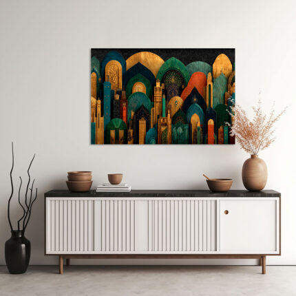 Art-Déco-Architekturvision mit ornamentalen Bögen, Palmblättern und goldenen Details in Teal und Gold
