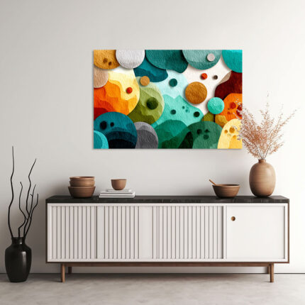 Spielerische Kreiscomposition aus bunten Papier- oder Filzformen in Teal, Grün, Gelb und Koralle