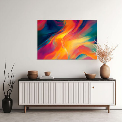 Fließende Farbwellen in leuchtendem Orange, Türkis und Blau als harmonisch-dynamische abstrakte Komposition