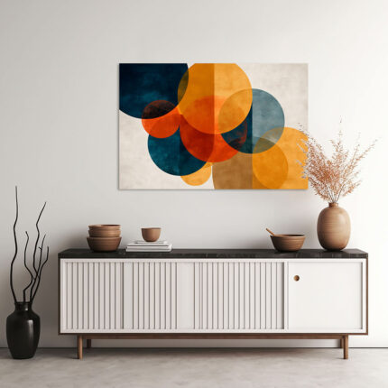 Dynamische Kreiskomposition in Dunkelorange, Petrol und Ocker mit kräftigen Überlagerungen
