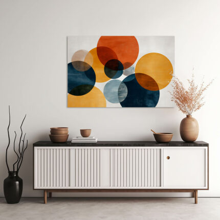 Luftige Kreiskomposition in Dunkelrot, Orange, Blaugrau und Ocker mit viel Weißraum