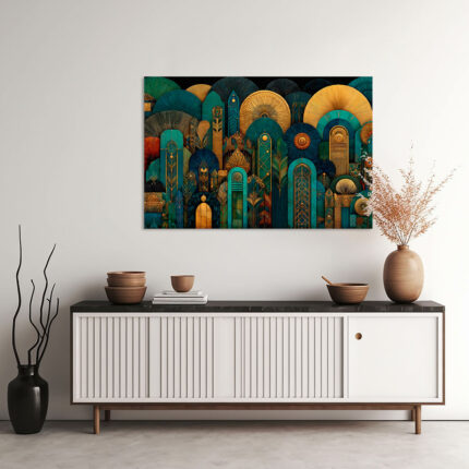 Art-Déco-Architekturvision mit ornamentalen Bögen, Palmblättern und goldenen Details in Teal und Gold