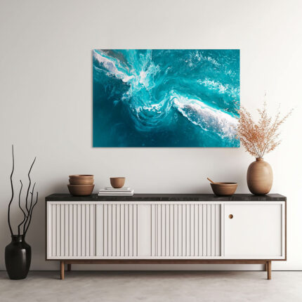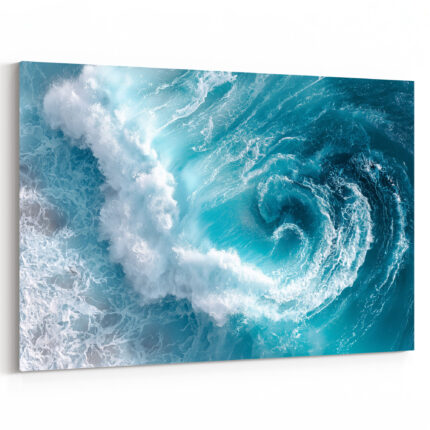 Türkisfarbene Meereswelle aus der Vogelperspektive mit weißem Schaumwirbel und Tiefenwirkung