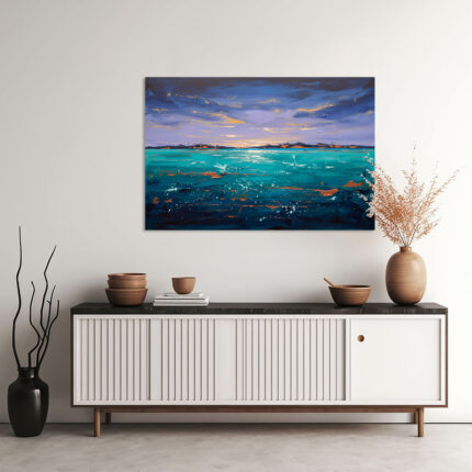 Expressionistisches Meeresgemälde mit türkisem Wasser, dramatischem Abendhimmel und Goldakzenten
