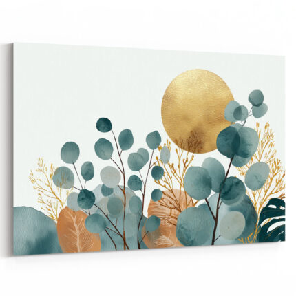 Eukalyptuszweige in Blau und Gold vor hellblauem Hintergrund mit goldenem Sonnenkreis